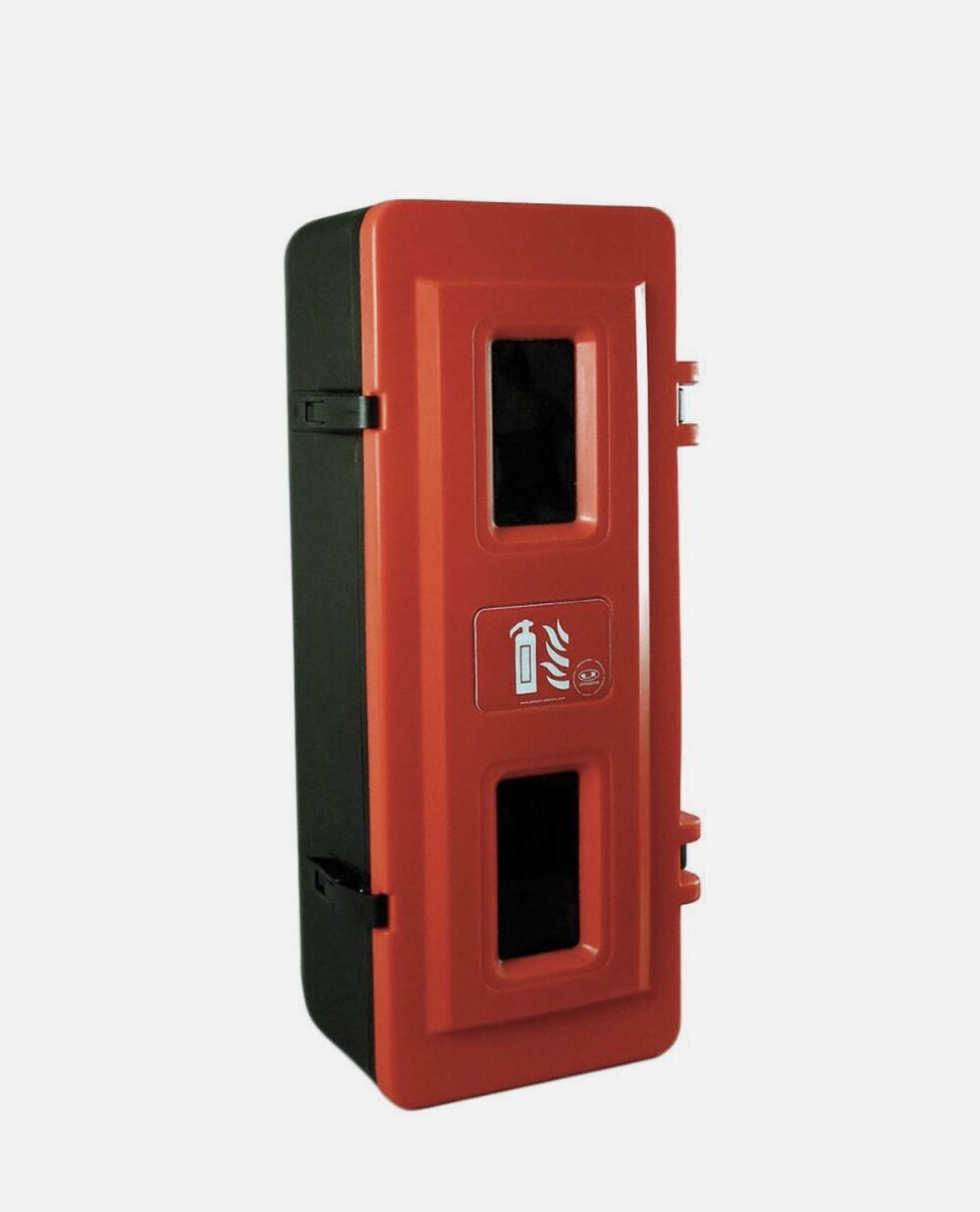 Fire Extinguisher Cabinet, For Location Indoor, Outdoor, For Tank Weight 20 lb, Housing Material Plastic, Mount Type Surface, Mounting Location Vehicle, Wall, Overall Height 32.5 in, Overall Width 13 in Fire Extinguisher Cabinets ⢠Surface-mountDurable, molded plastic cabinets can be used indoors or out; protect extinguishers from exposure to dirt, dust, water, and chemicals. Left- or right-hand opening for easy access in the workplace or in a vehicle. Hook-and-loop straps keep extinguisher secure inside.