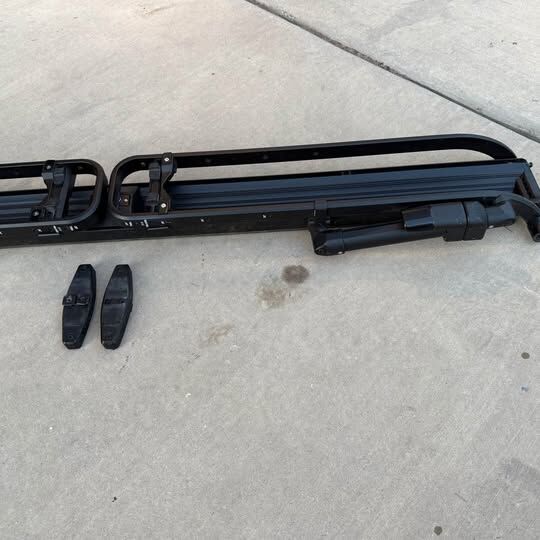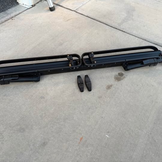 Retails for $600, used only two or three times. I purchased these for a sprinter rack experiment that isn't going to work out. Includes the key and mounts for a T-channel roof rack mount.
