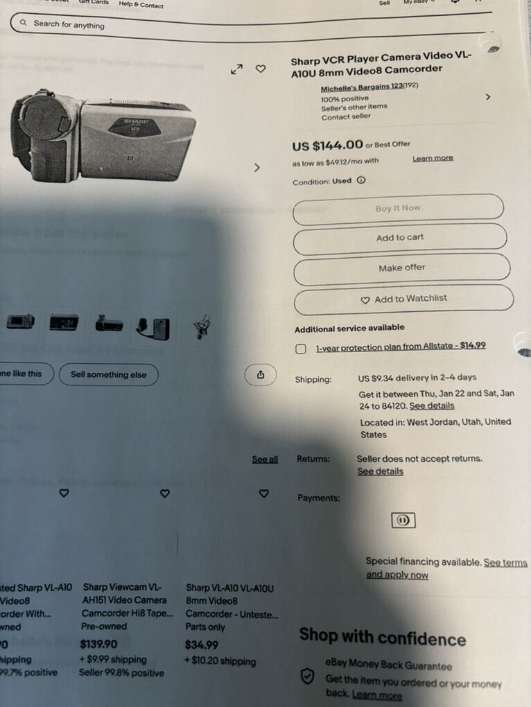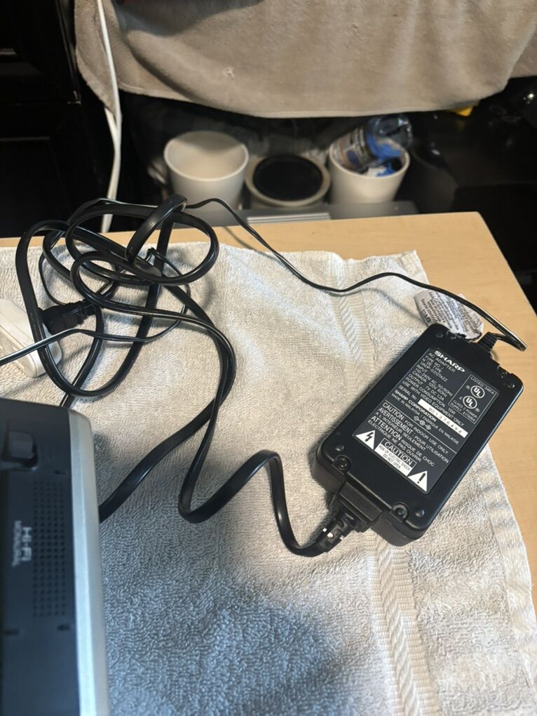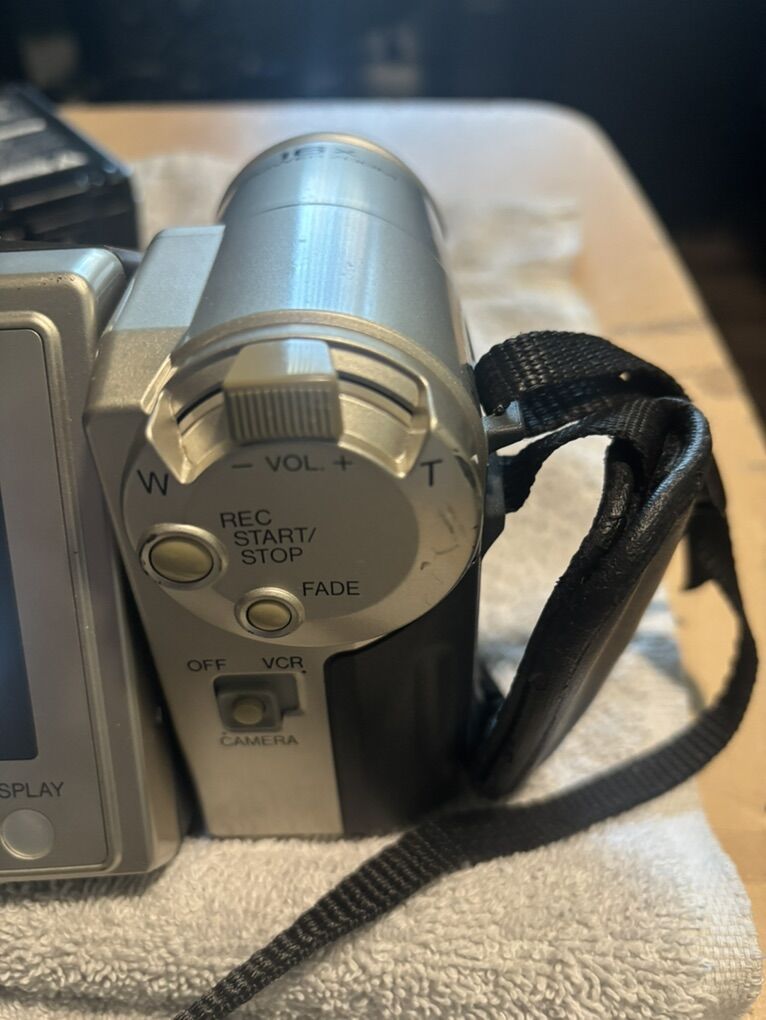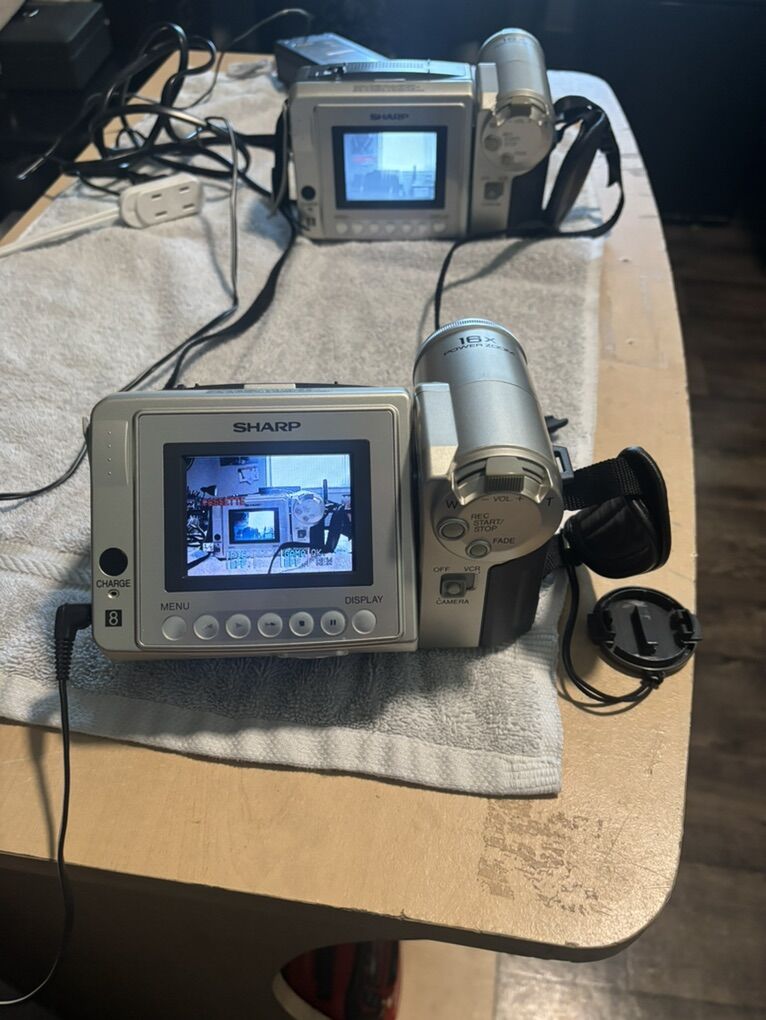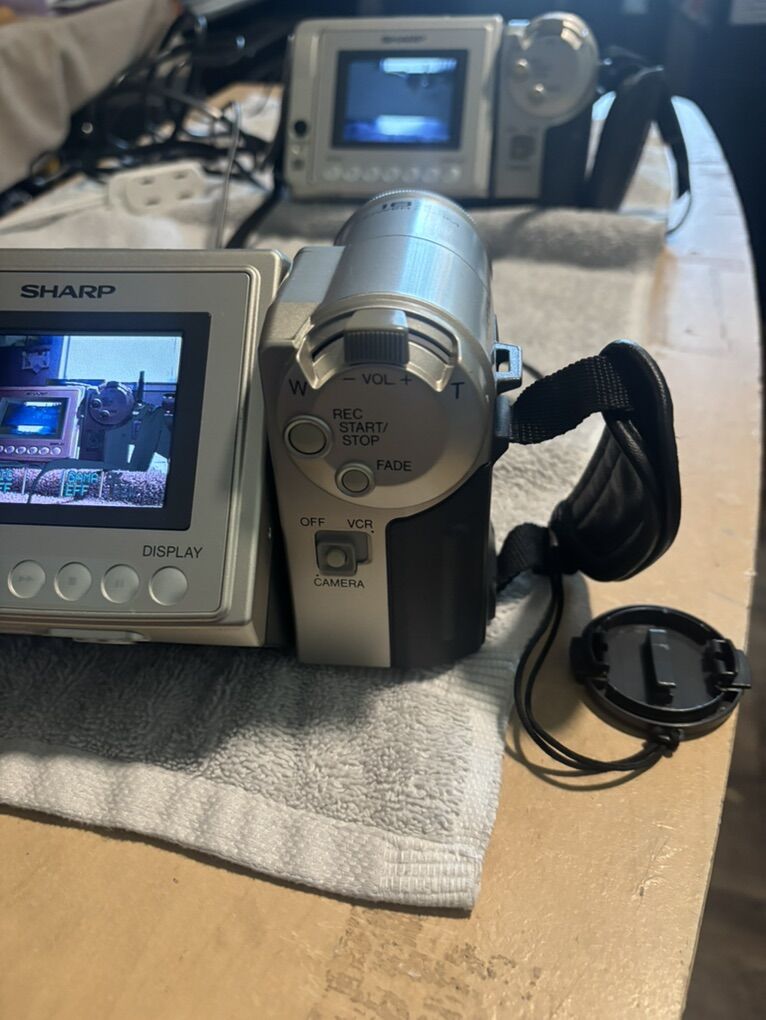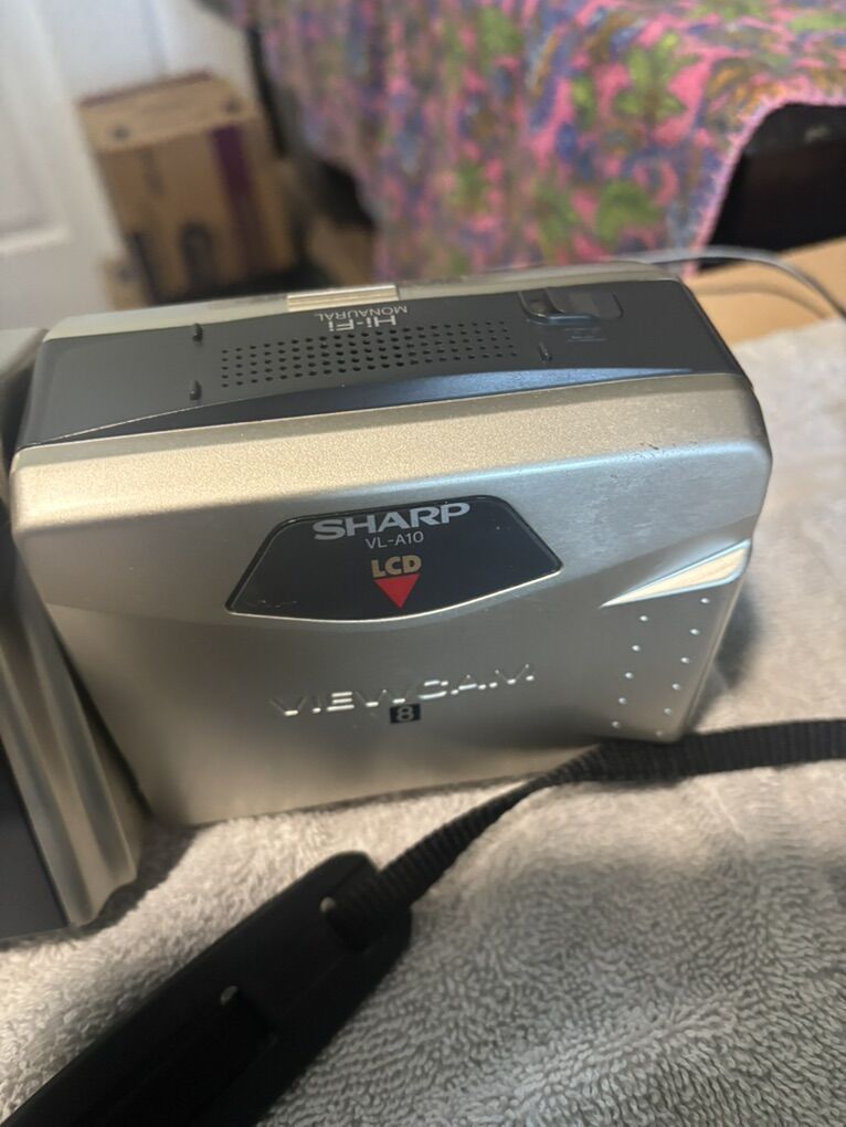 Sharp size is color gray /silver/crème camcorder 8mm /video 8 model vl-a10u. Tested works have two both work one needs a battery
