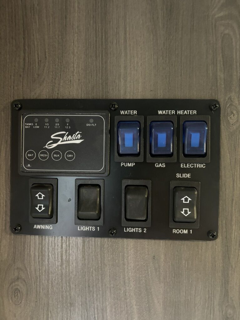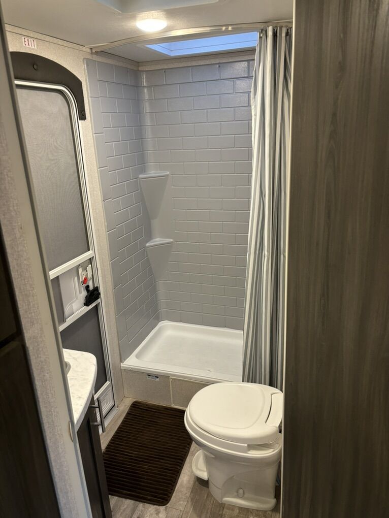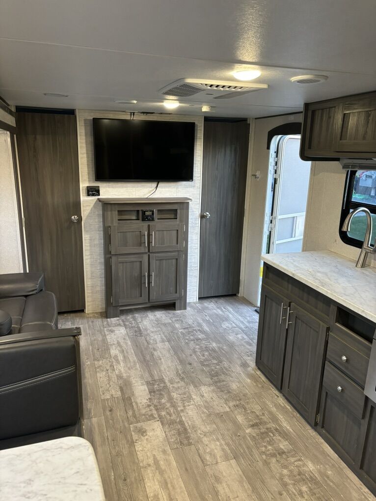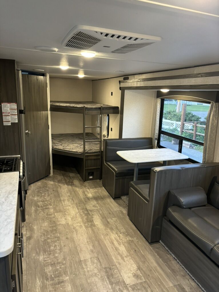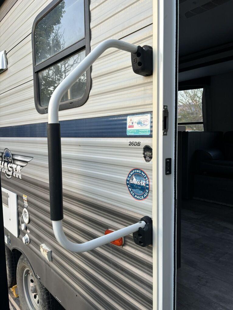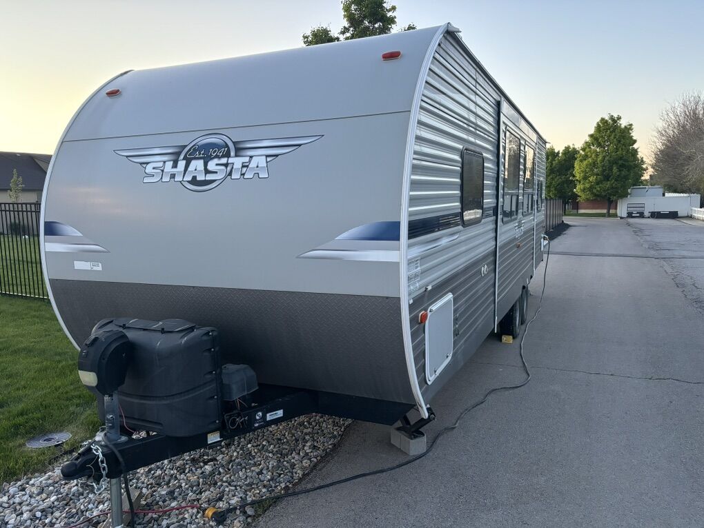 2021 Shasta by Forest River M-26DB Excellent Condition & Sleeps 10 Large Slide-out with dining table & sofa Double size bunk beds Dual entry doors for easy access to bathroom from the outside Fully equipped kitchen including 10 cu ft residential refrigerator, 3 burner stove, oven, overhead microwave and pantry Private front bedroom with RV queen bed and ample storage Media including TV, bluetooth stereo with interior and exterior speakers Air Conditioner & Central heating Outdoor shower Power awning with LED light Full pass through storage Power tongue jack Solar panel ready