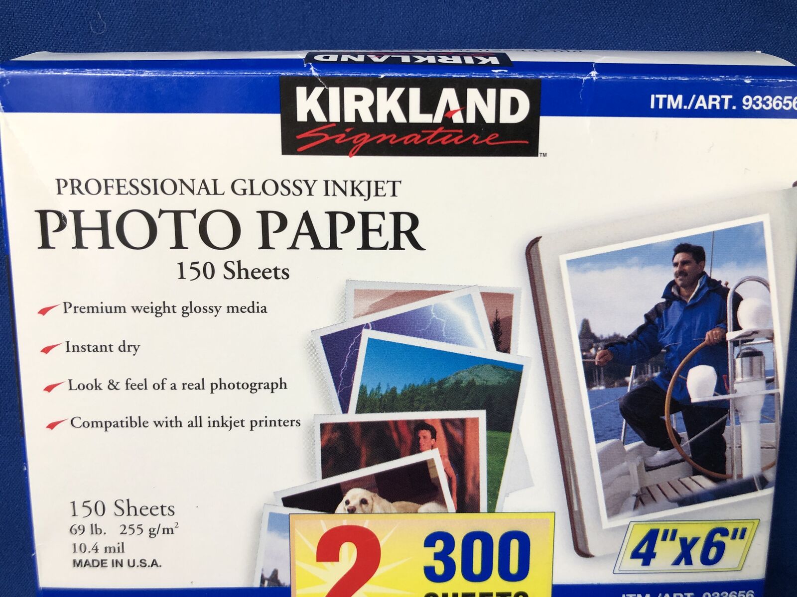 VenmoLot of Kirkland Professional Glossy Inkjet Photo Paper totaling 300 sheets (two packs of 150). One pack has been opened and still contains over 100 sheets remaining; the second pack is factory sealed. High-quality glossy finish ideal for vibrant photos and sharp image printing. Compatible with inkjet printers. Great value bundle for home or office photo printing.