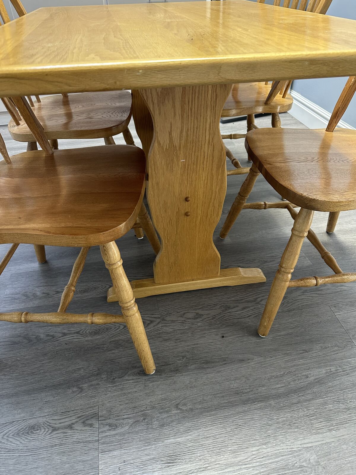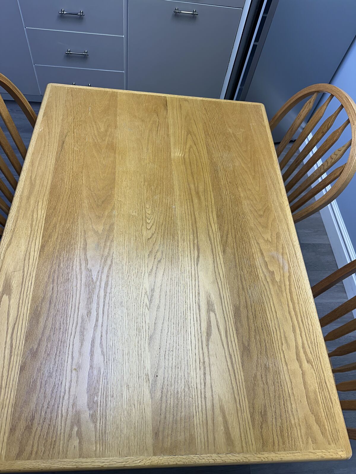 Used but good condition. Light wood color, four chairs. Great for an apartment or a small office break room.