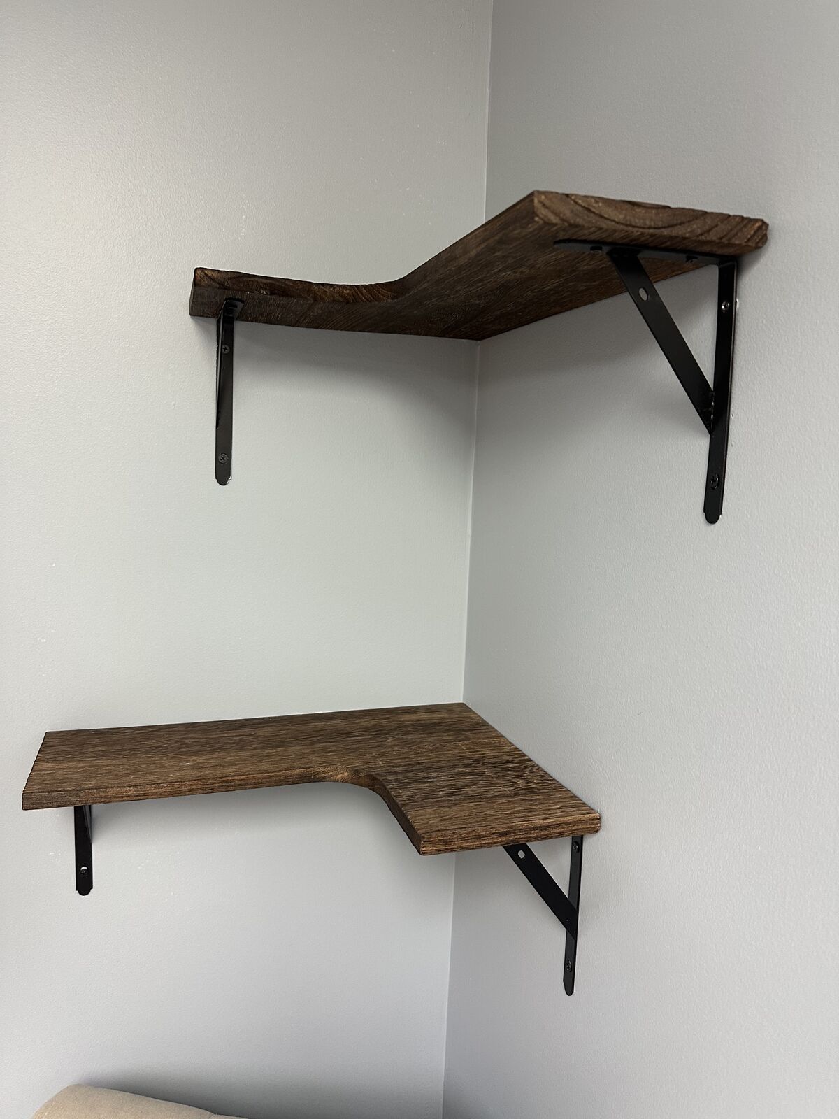 Four total corner display shelves- black hardware and brown shelving. Used but good condition. $10 each.