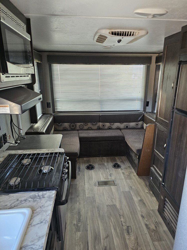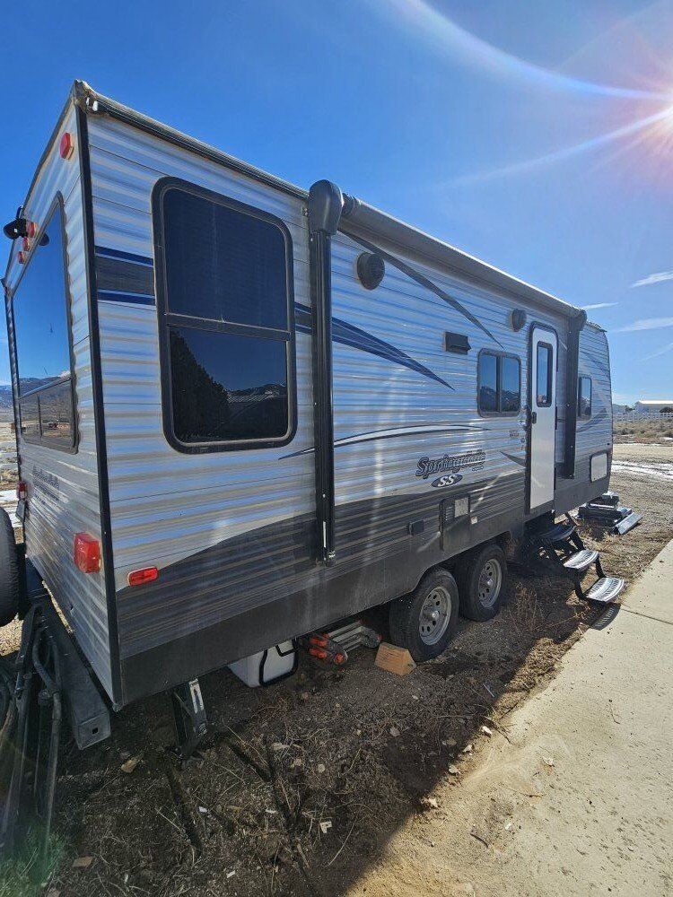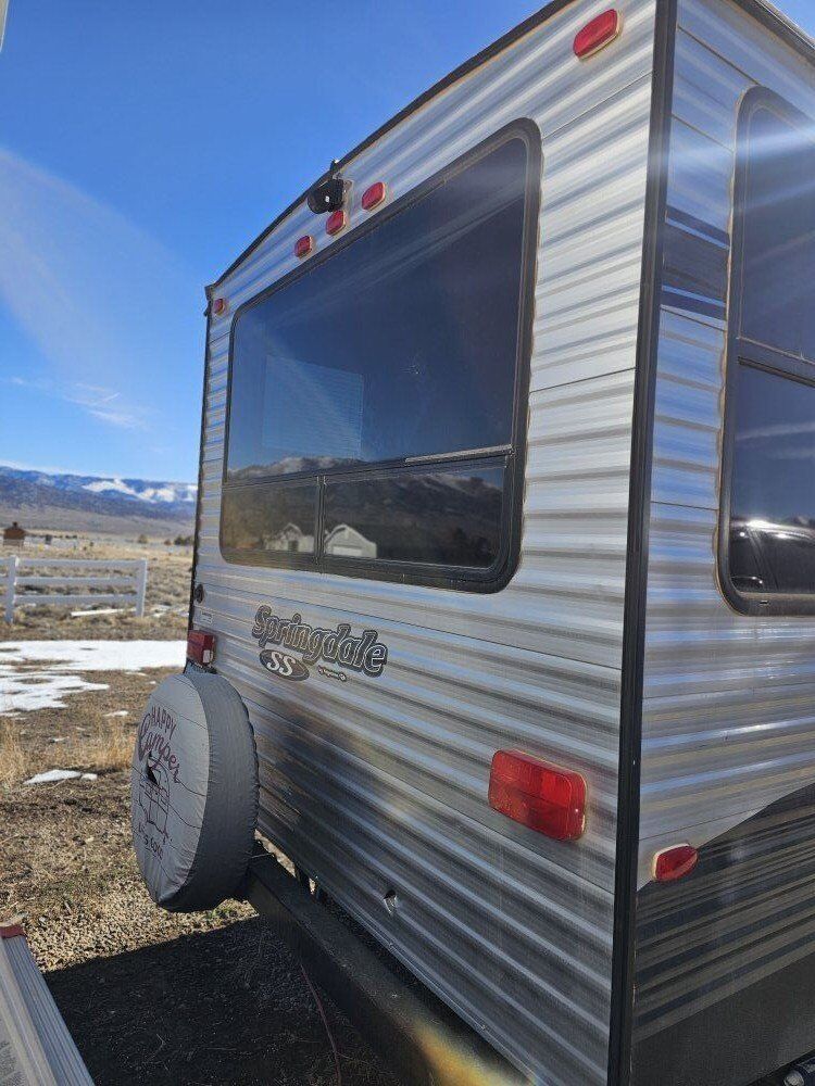 2018 keystone springdale 2020qb (m-202). We've had the trailer for 2 years. Upgraded to a 5th wheel few months ago. 24 ft trailer with no slide outs. No water damage. Queen front bed. Comes with hitch stabilizer. Has small hole in back by spare tire from a handlebar and a 4 inch tear in canopy. Title in hand. Partial trade possible.
