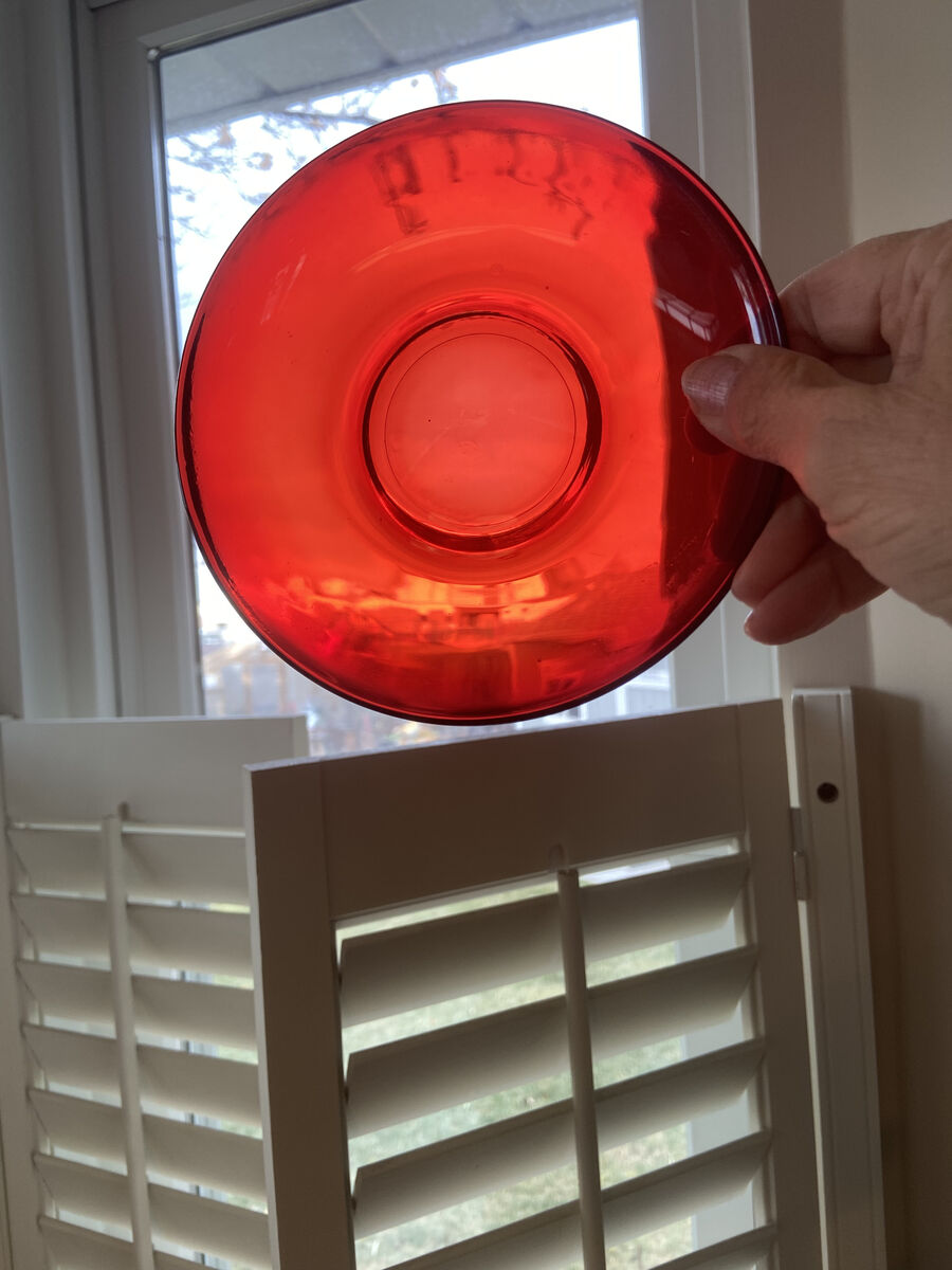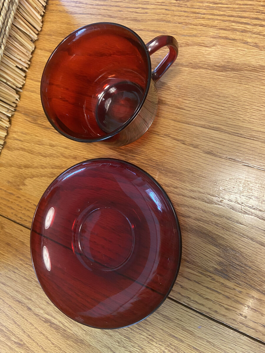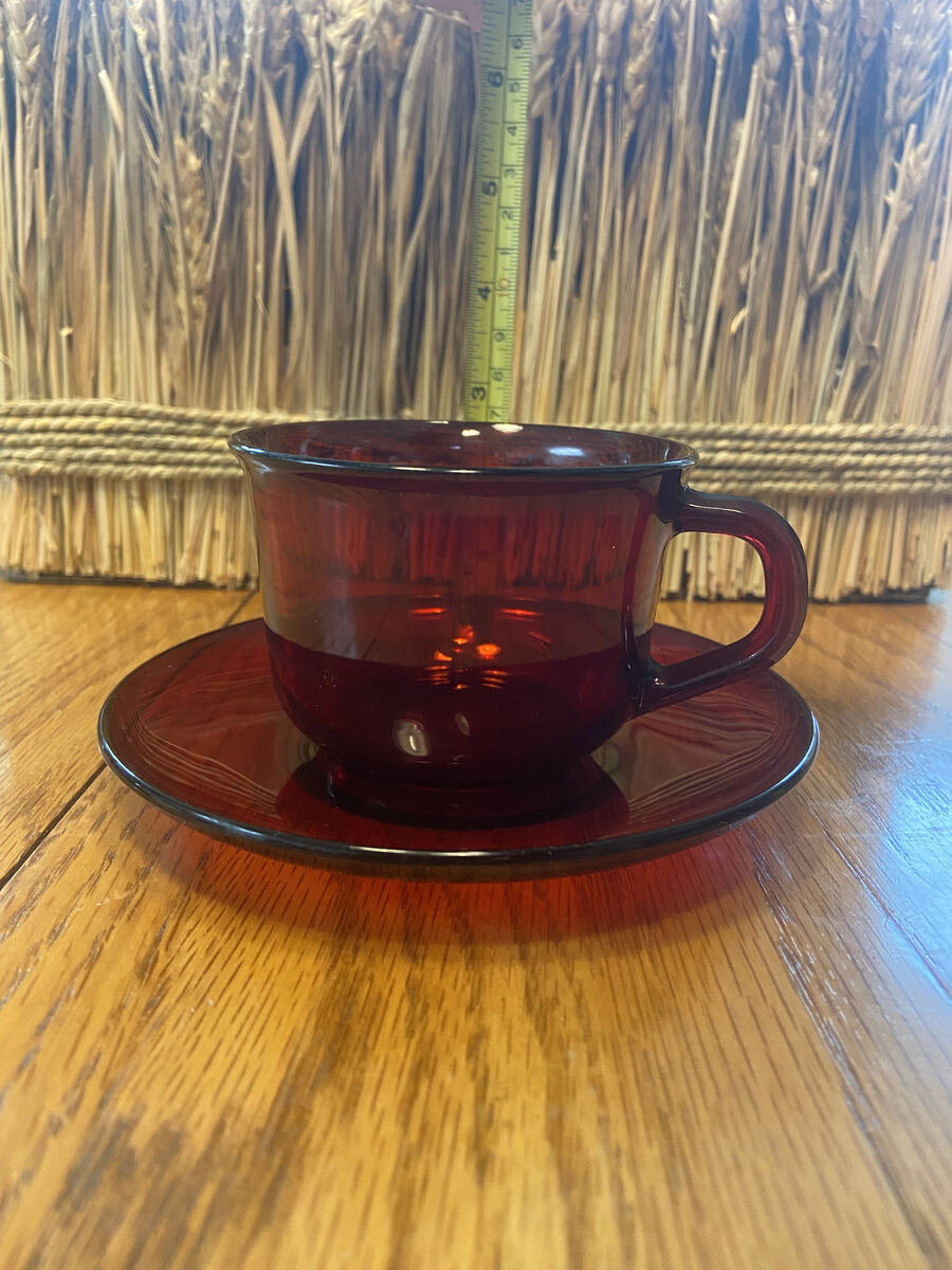 VenmoBeautiful Anchor Hocking Royal Ruby Red Glass Tea Cup and Matching Saucer. This treasured cup measures 3 5/8" in diameter by 2 3/8" tall and sits on a saucer measuring 5.5" in diameter. It is in great condition.