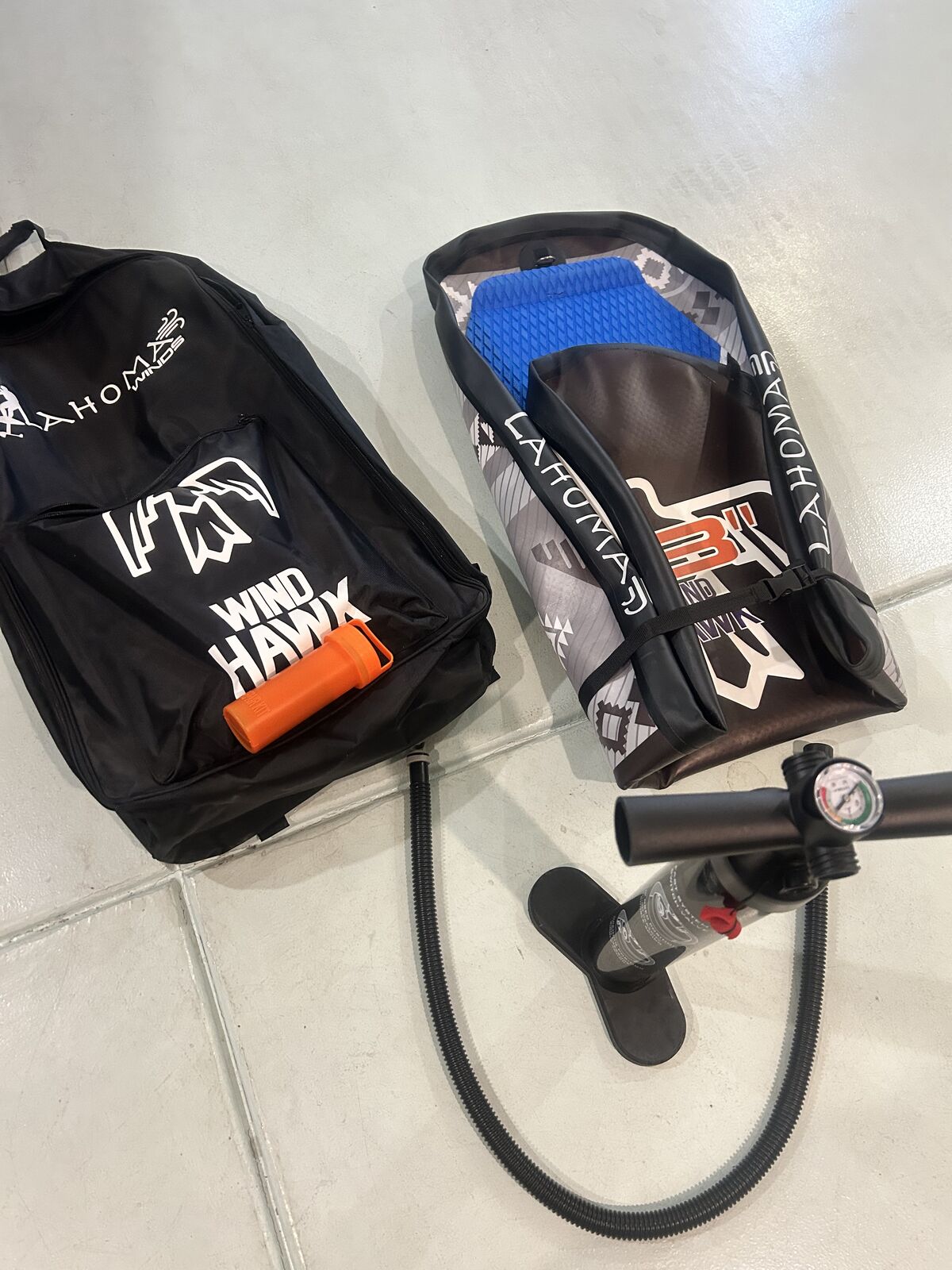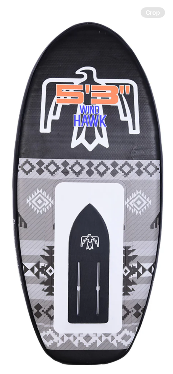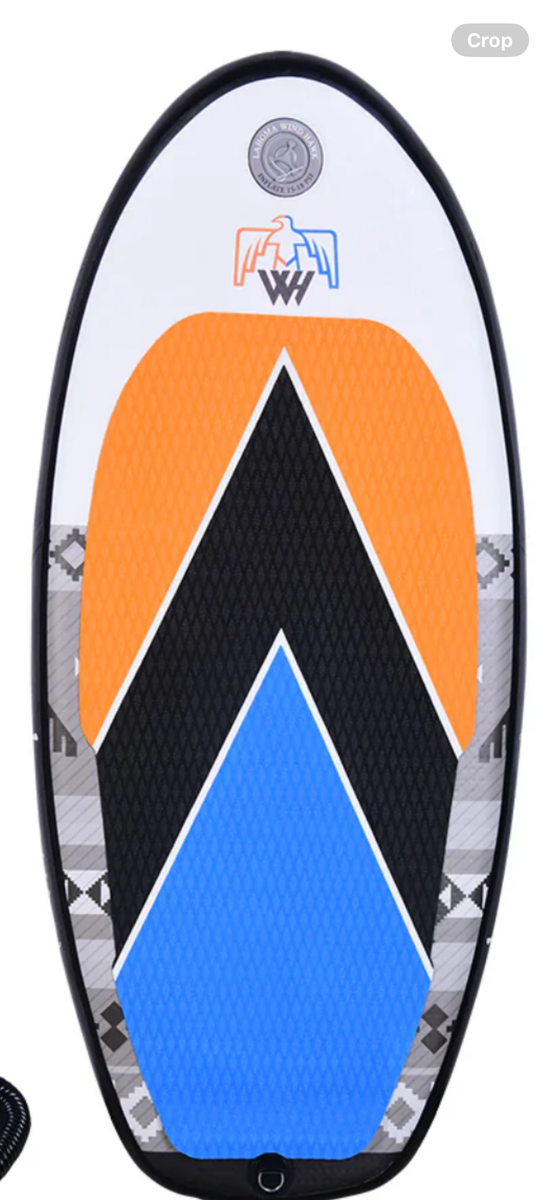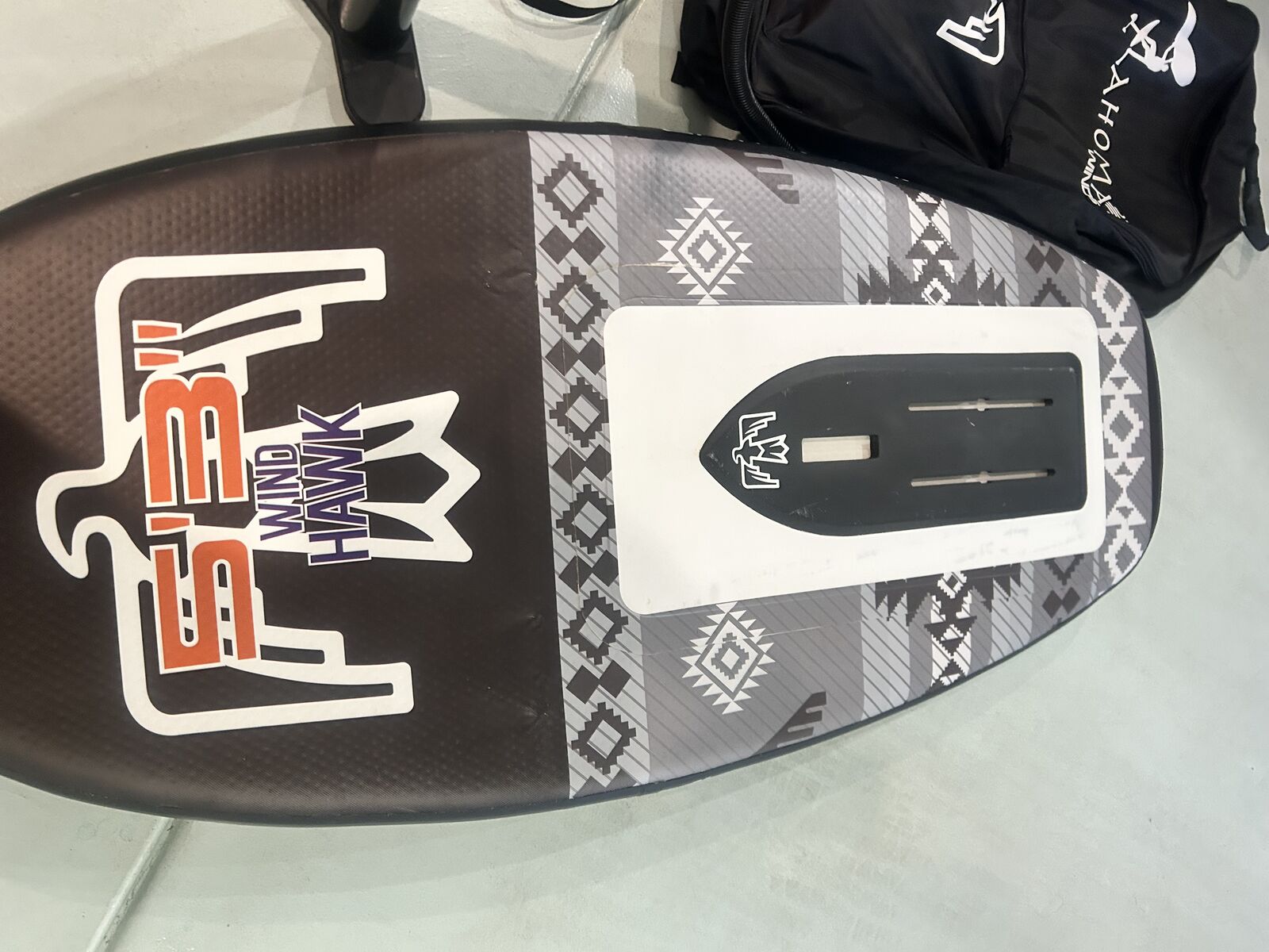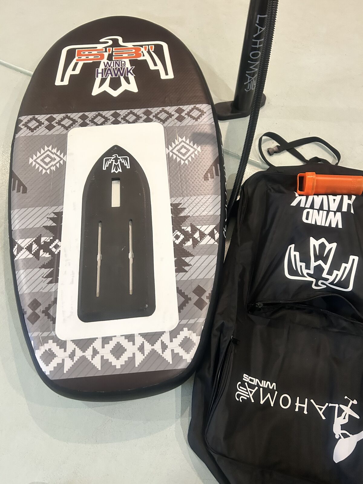 Foil surf board, 5'3"--volume 110-- this size is recommended for 110 pounds to 220 pounds recommended, this is an inflatable, so it's a soft board if you fall on it, very easy to store has a nice bag and pump, super easy to pump up, this is made by Lahoma winds, ( wind hawk) we've only used this once, it is like brand new, this new, would be over $400
