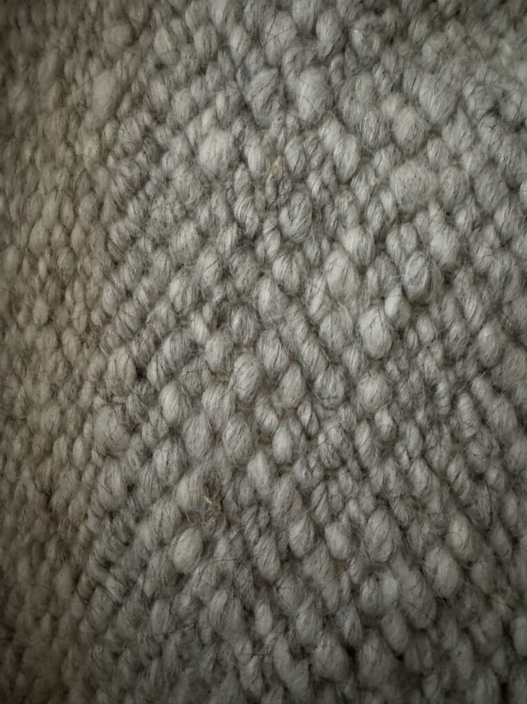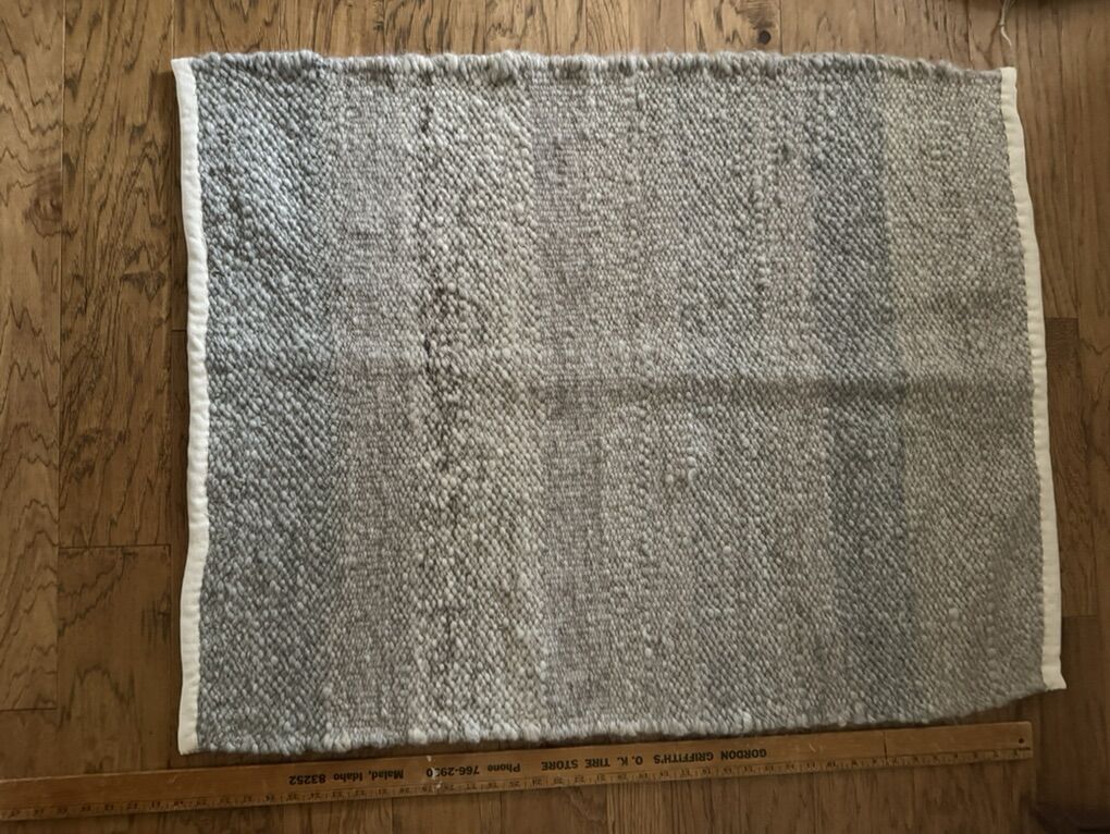 Handwoven wool rug approximately 40x32 inches with linen bound edges. Natural color of wool is light gray with some darker and lighter grays and blues. Wool from Icelandic sheep, washed, combed, and hand spun, woven on linen warp. $ 125 plus shipping( if applicable).