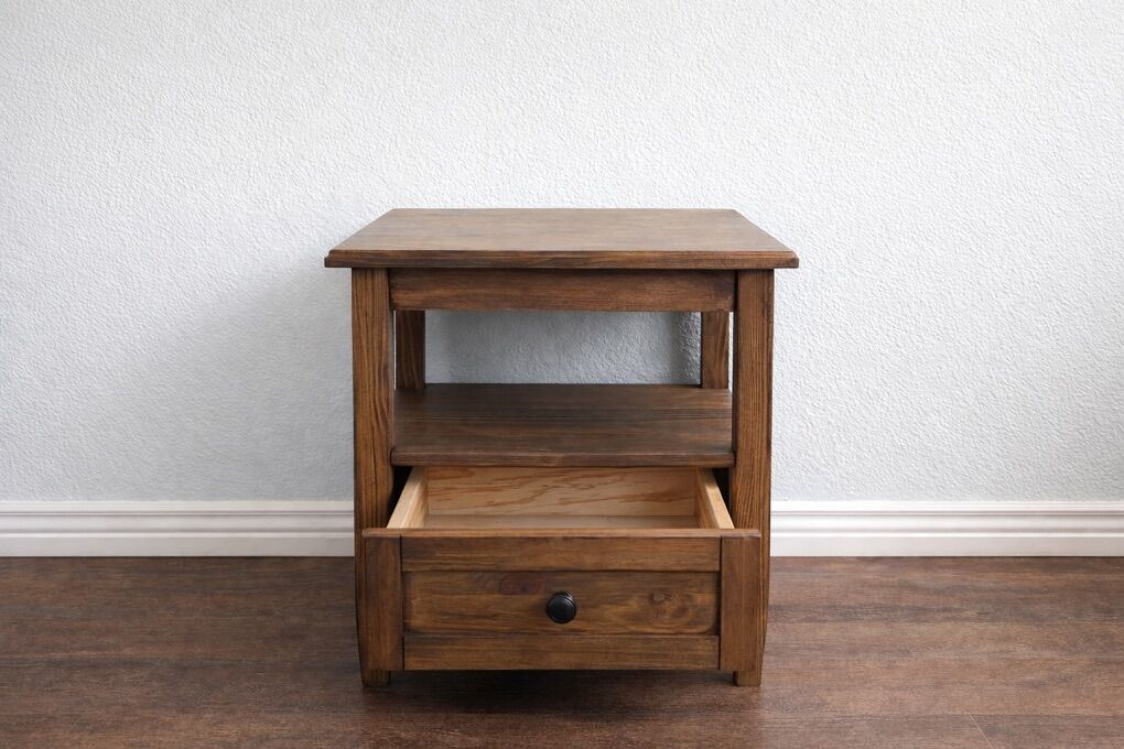 Description: Solid wood nightstand, freshly refinished in dark walnut. Smooth drawer, sturdy build, clean inside and out. Great size for bedroom or guest room.
