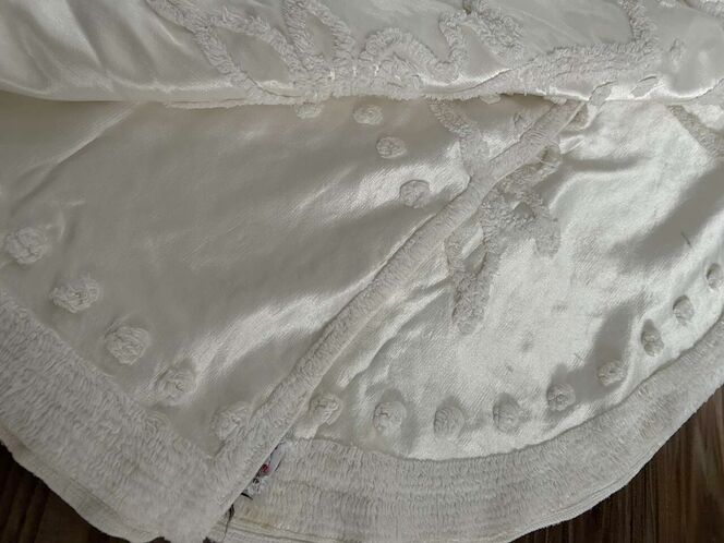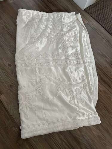 PayPalThis is absolutely stunning! Solid white. Polyester, but feels it looks like silk. The design are cotton threaded. This has no stains in it or on it, it has a few frayed marks, which is shown in the very last picture. 90 inches wide x 98 inches long. The top is straight lined, the bottom curved....I wish they still did this! $59