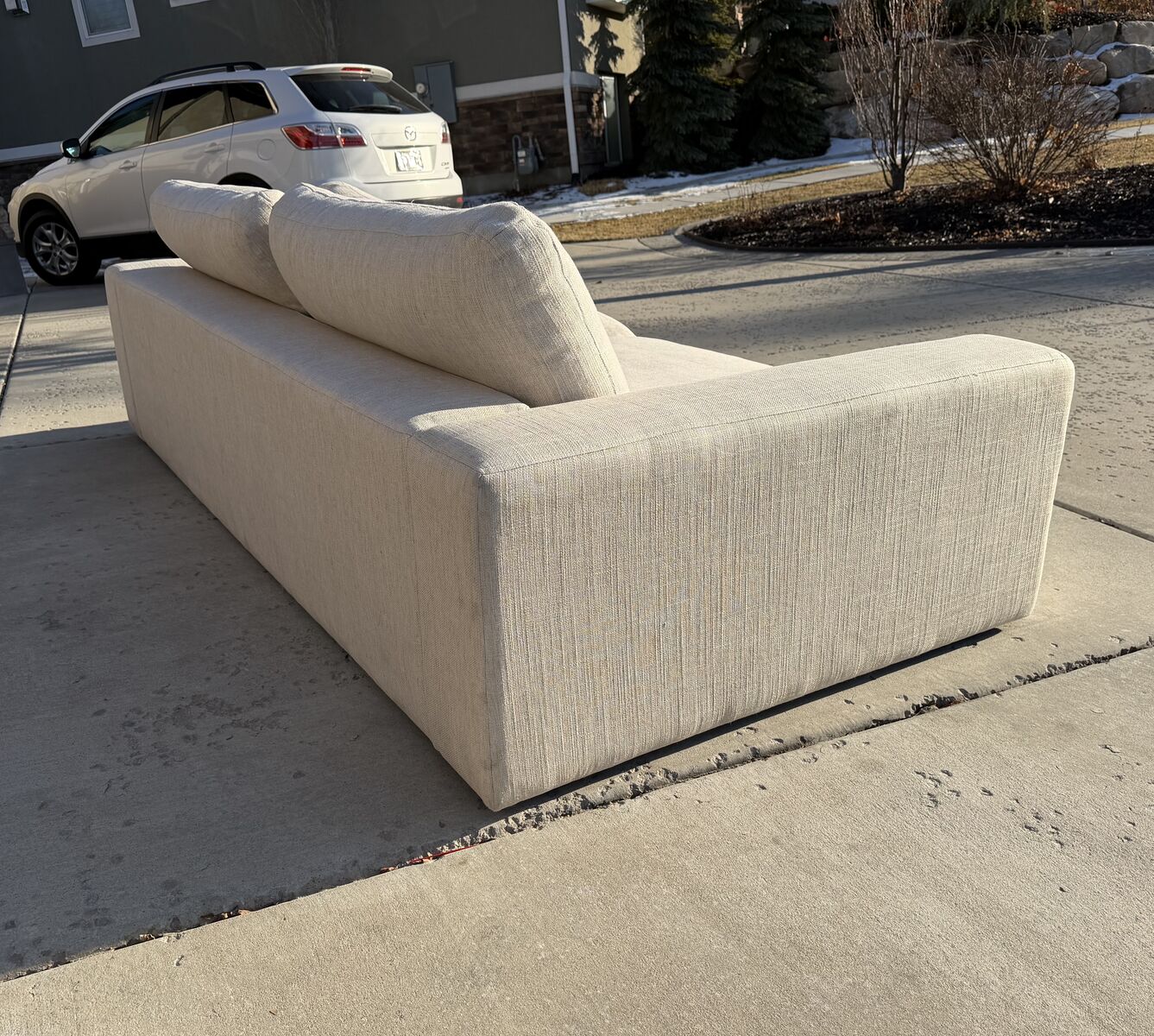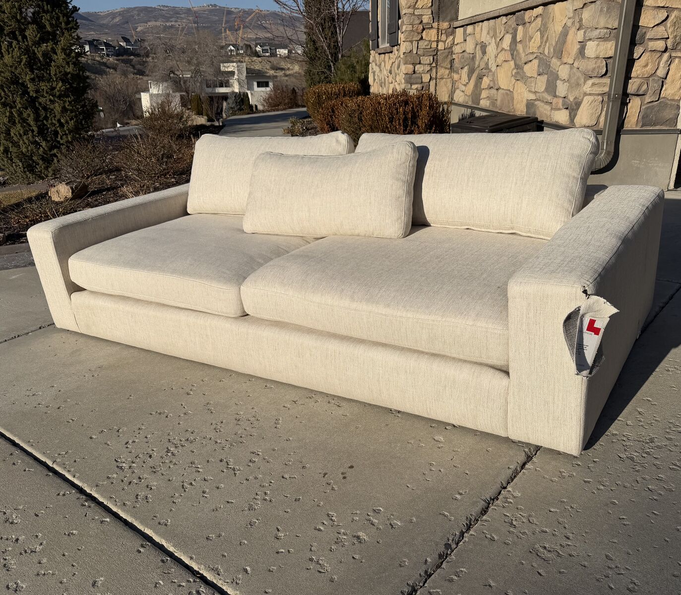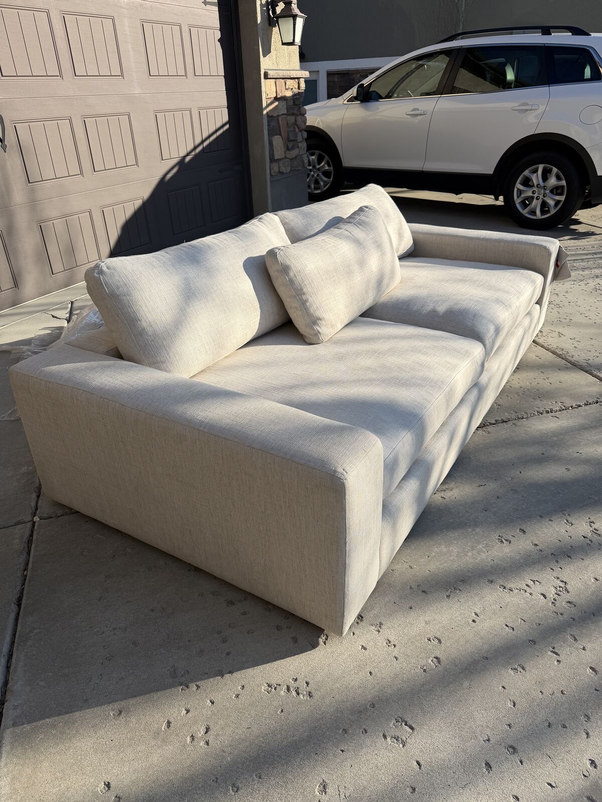 ZelleFour Hands couch purchased from the Grove Collective. Brand new and never used. 98” wide modern neutral sofa with tight woven fabric. The color is cream but the high quality woven fabric gives slight color variation to go with everything and also gives beautiful texture. It sat completely wrapped in storage since we bought it. Clean lines, wide arms, deep seats, and very comfortable.