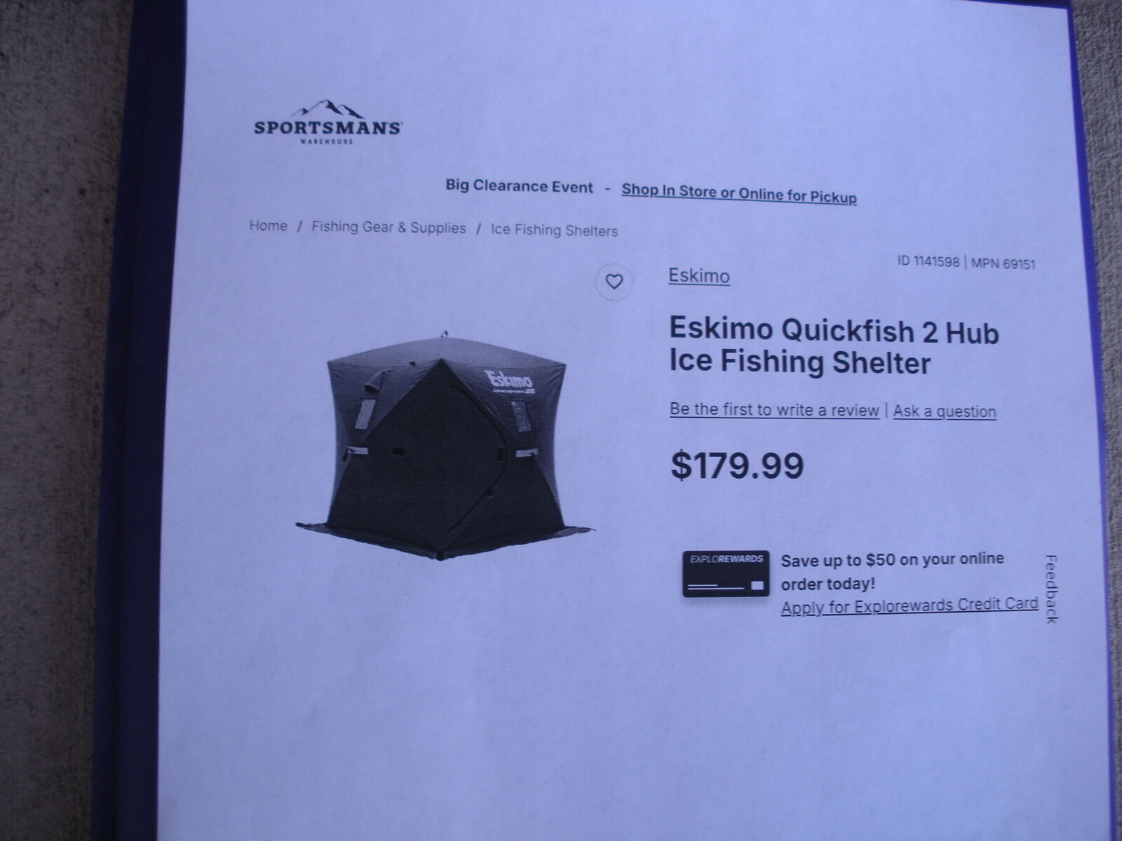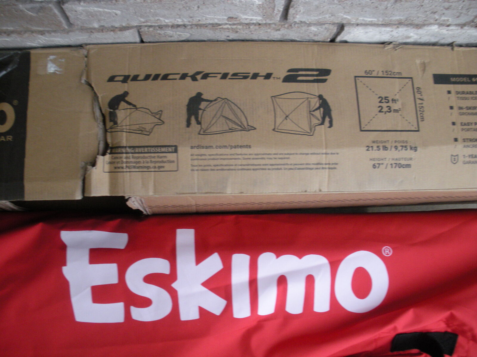 ESKIMO QUICKFISH 2 ICE FISHING SHELTER, 2 PERSON, HAS CARRYING CASE WITH SHOULDER STRAPS, NEW IN THE BOX, $120.00, CASH ONLY.