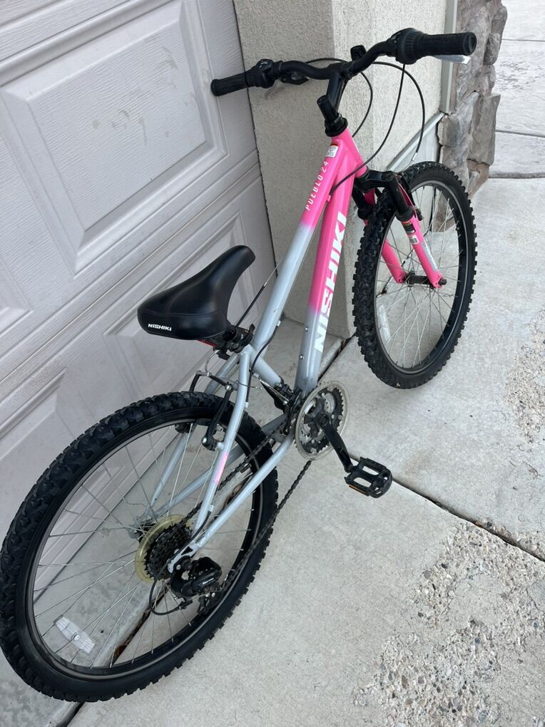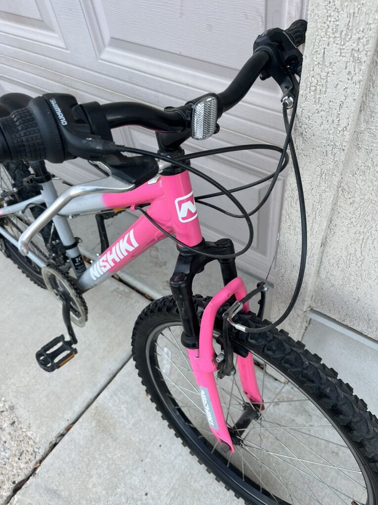 Pink Nishiki Pueblo 24, with 24 inch tires. The frame size is 13 inches, front suspension, seven speed adjustable seat.