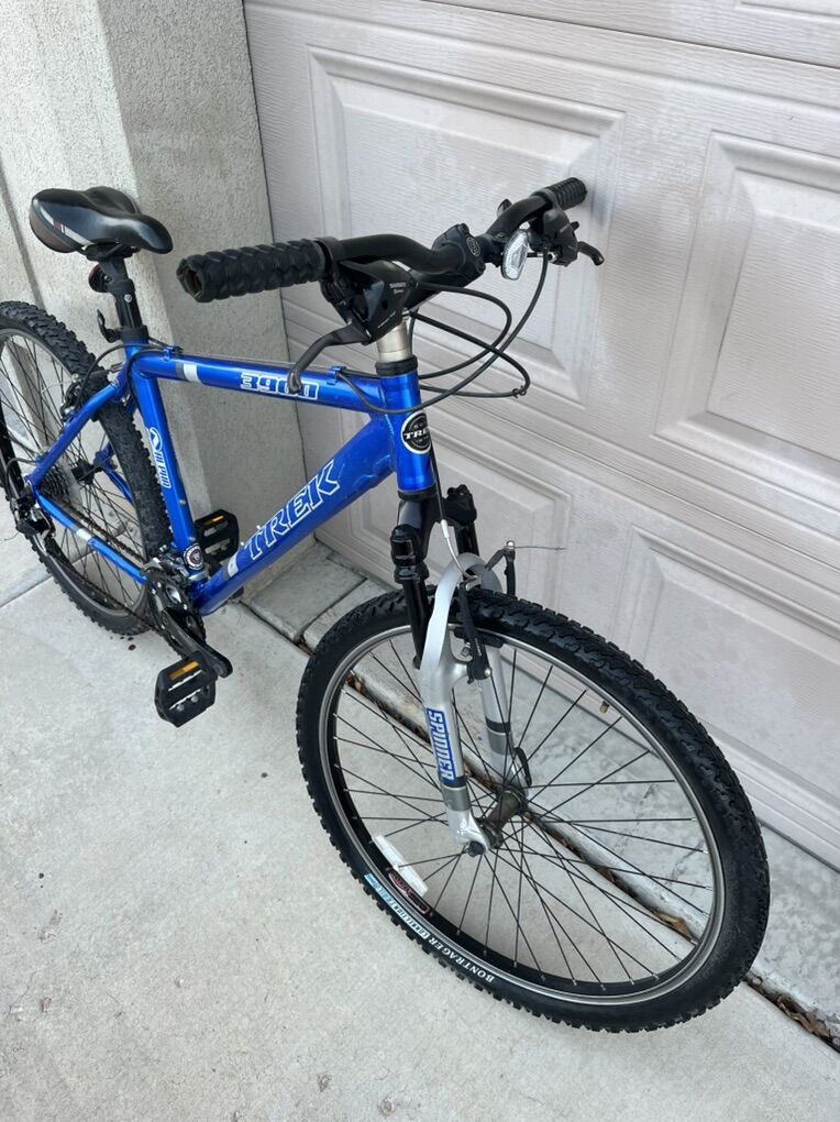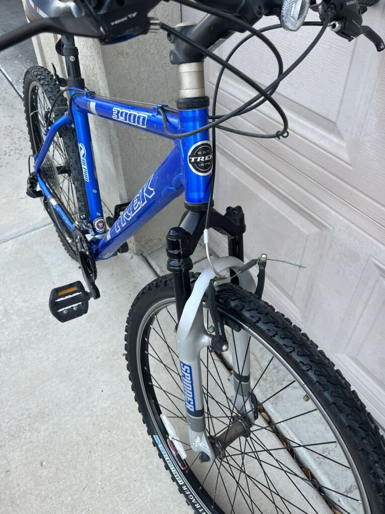 Blue Trek 3900 front suspension, 26 inch wheels, the frame size is size 19, 24 speed, alpha custom aluminum with BONTRAGER connection trail Tires