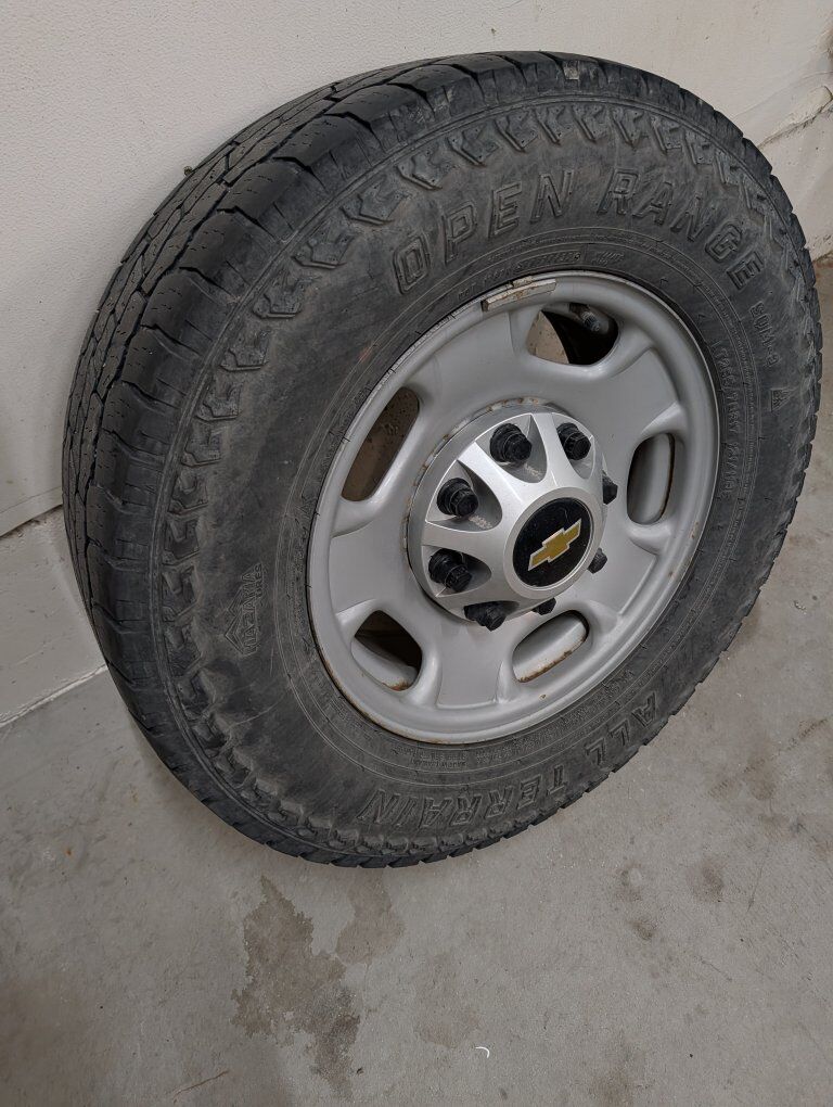 Set of four 8x180 Chevy Silverado take off wheels and tires. Tires are 265/70R17 with a little life left on them. Includes all 4 center caps and lug nuts. Steel wheels are in great shape.