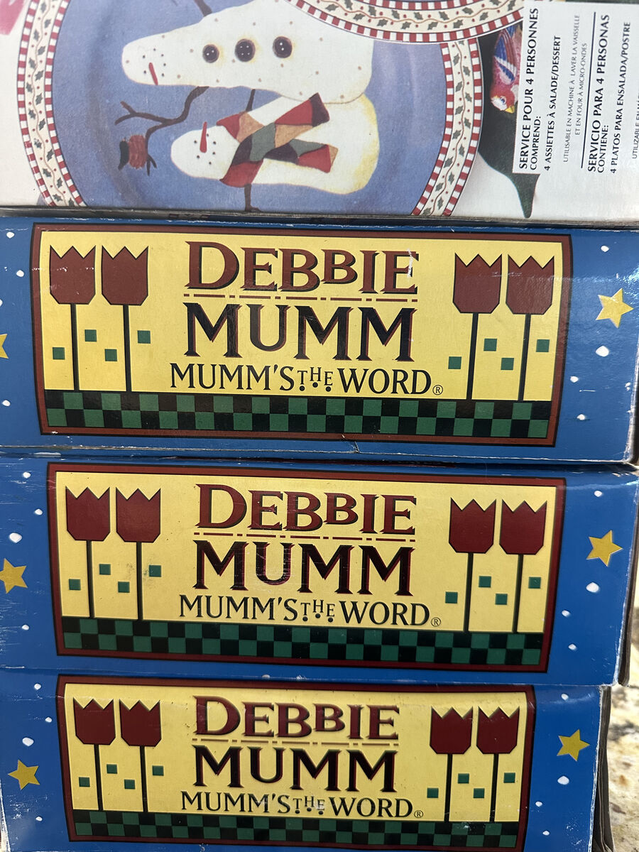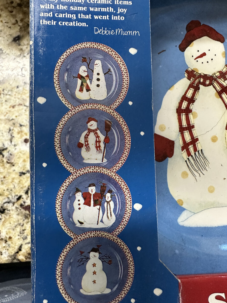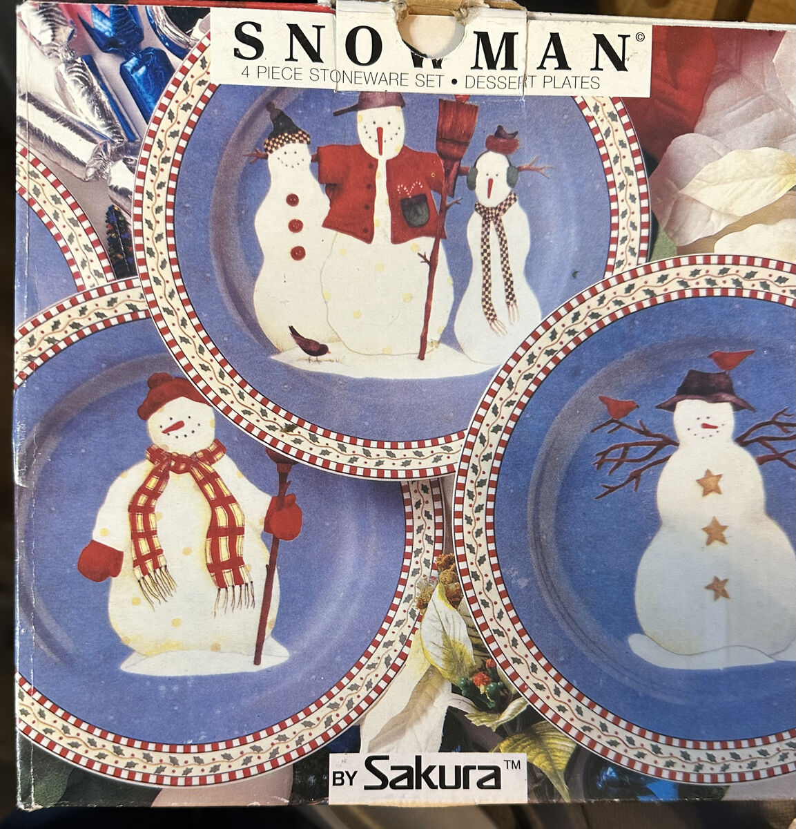 VenmoAfter the Christmas decorations are put away, the house just looks kind of sad. So I bring out the Jolly Snowmen in January! The Sakura Snowman Debbie Mumm Set of 4 Salad/Dessert Plates is a festive and charming addition to your holiday table setting. Made of stoneware and ceramic, these round plates feature a Christmas pattern with a snowman design by Debbie Mumm. This vintage set from 1998 includes four pieces, perfect for serving salads or desserts during the holiday season. The multicolor plates are sure to bring a touch of holiday cheer and nostalgia to your dining experience.