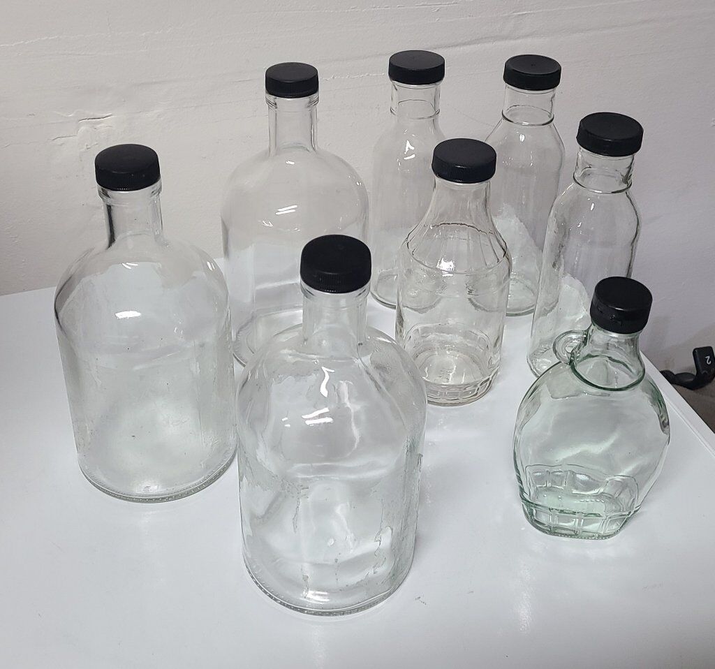 A variety of jars and jugs with black lids. 12 are included in the price. Some are not pictured.