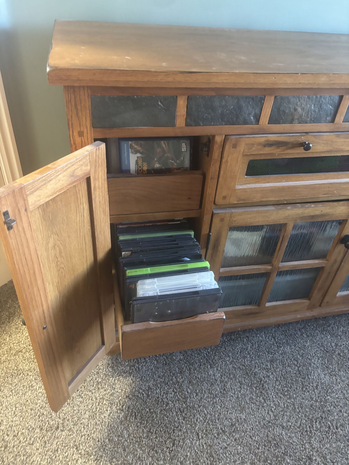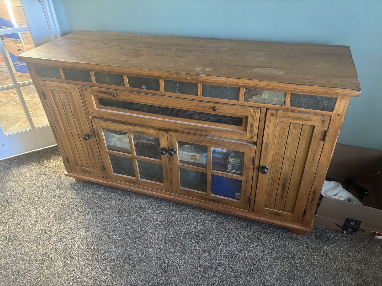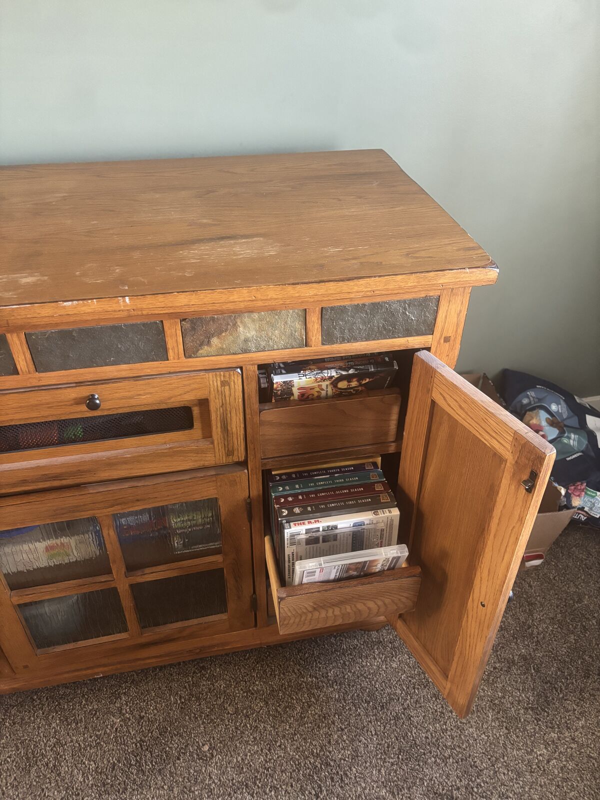 This is from RC Wiley and is in good condition. Plenty of storage space. Tile and light brown wood. Sturdy.