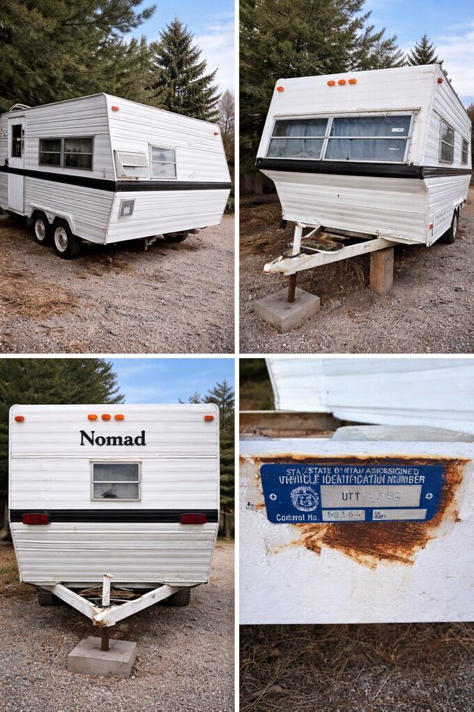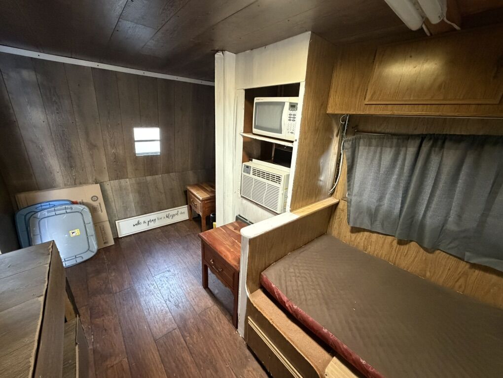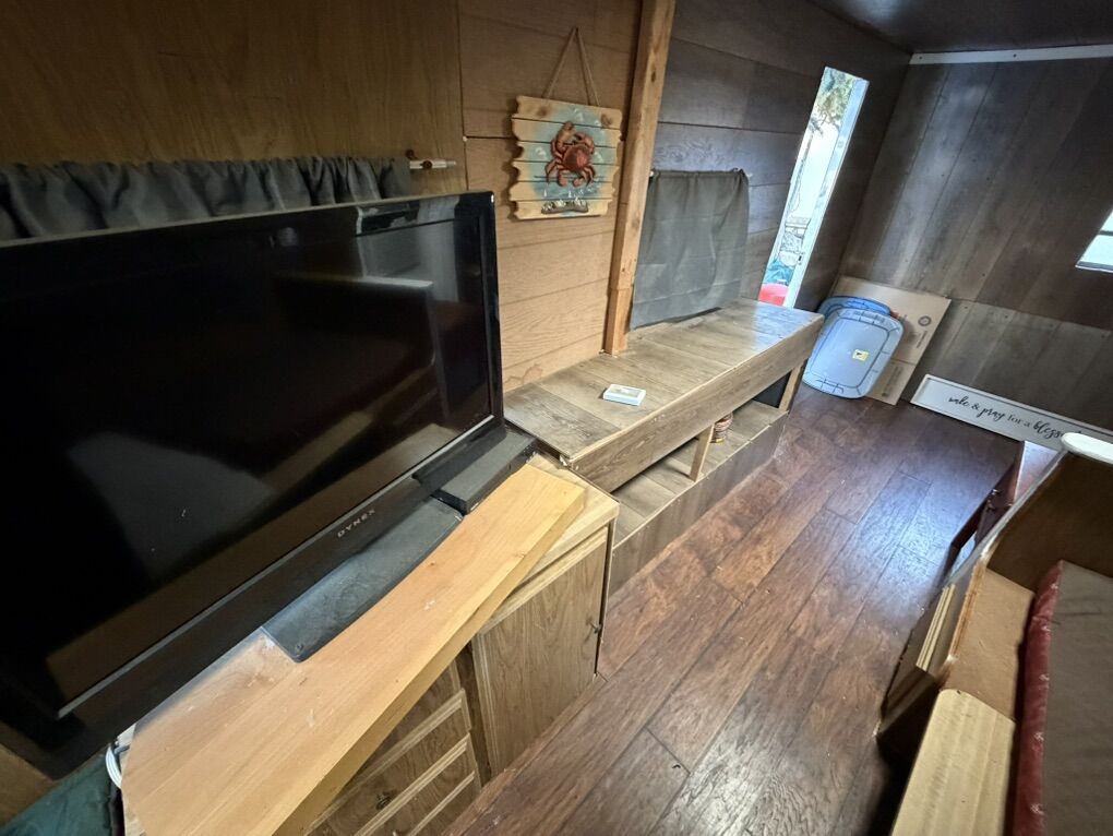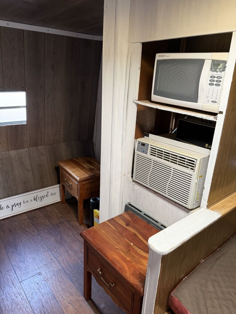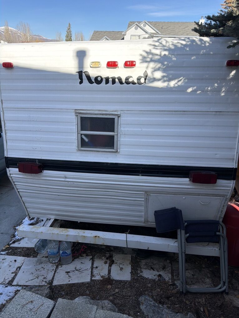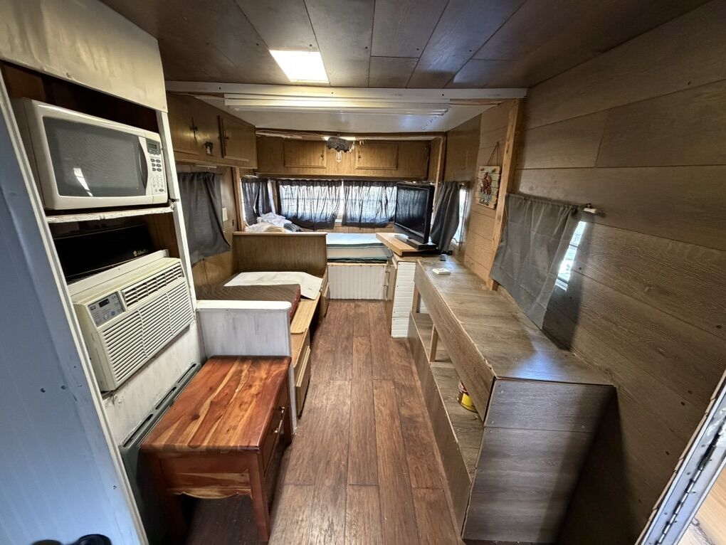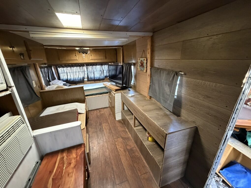 Venmo24’ trailer. Has air conditioner, stove, microwave, lights. Also exterior trailering lights, marker lights