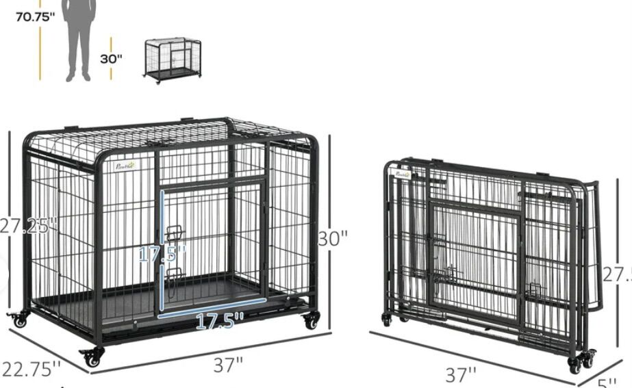 Paw Hut folding metal dog crate kennel with wheels and brakes. Removable tray, top and side open/doors. Good condition. 37”W x 22.75” D x 30”H (including wheels)