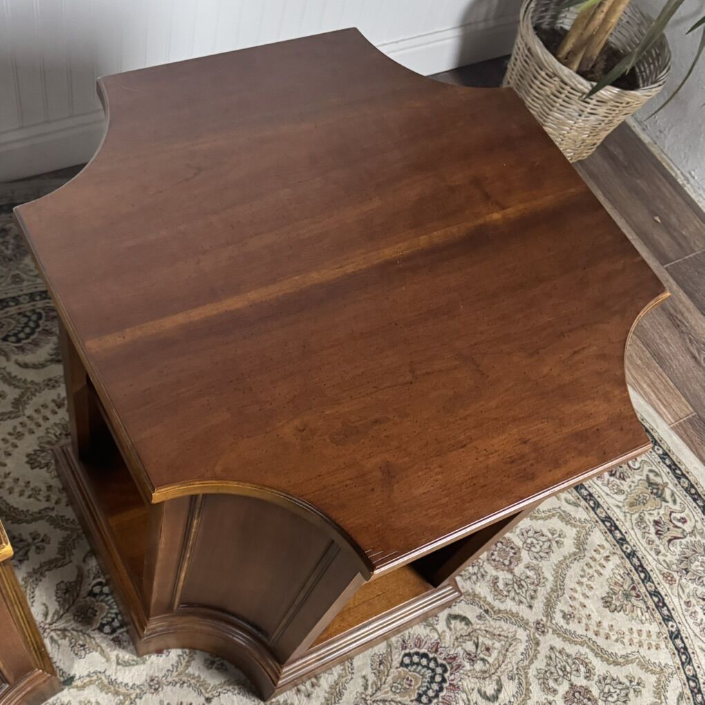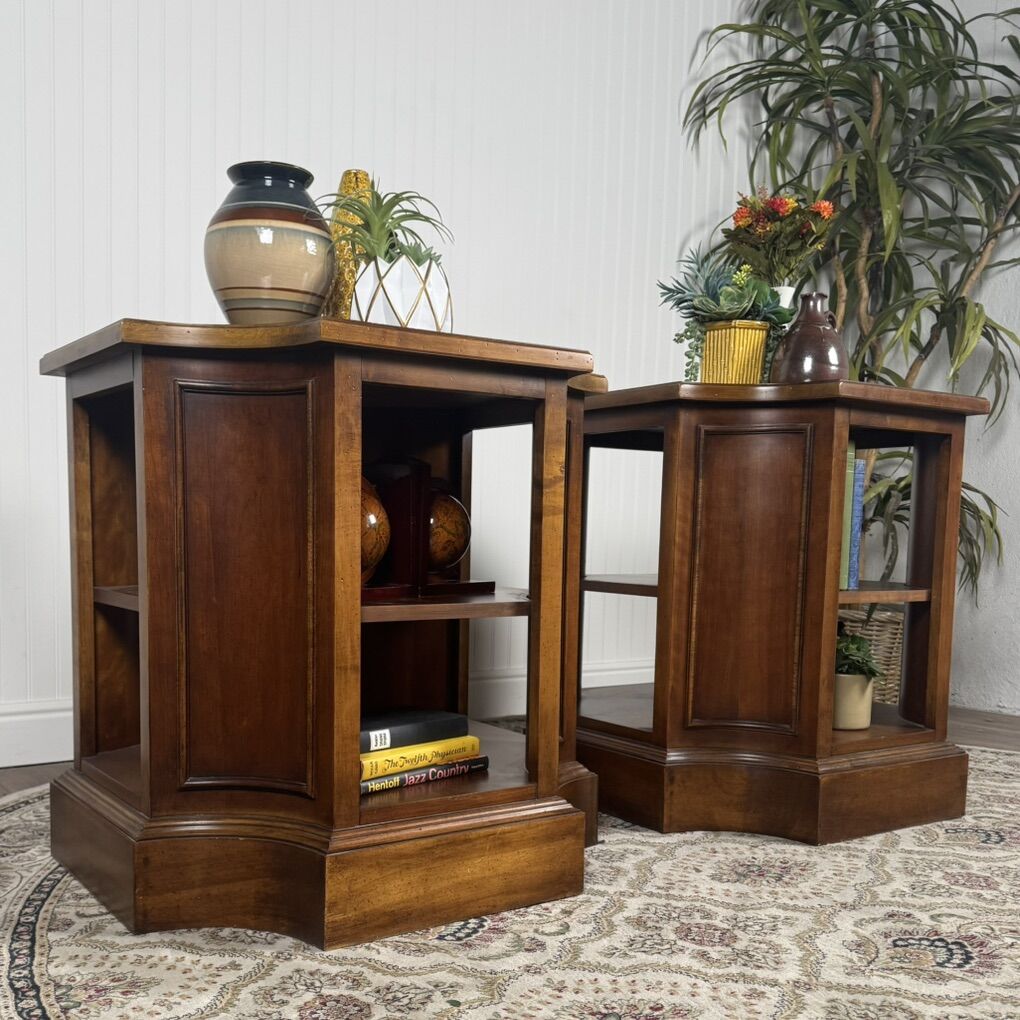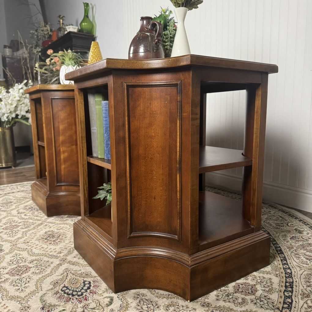 VenmoBeautiful pair of solid wood end tables with rich, warm wood tones and classic paneled detailing. These are substantial pieces with thick tops, sturdy plinth bases, and solid construction.