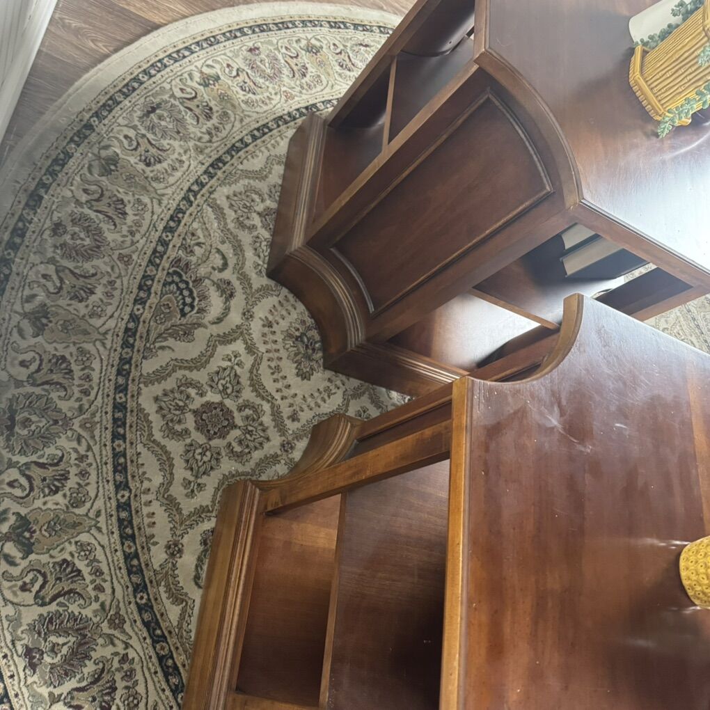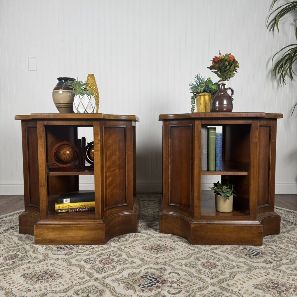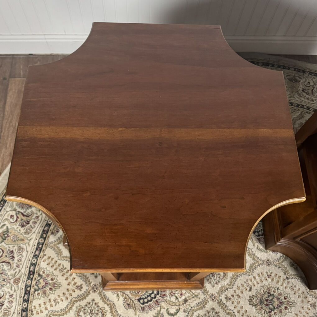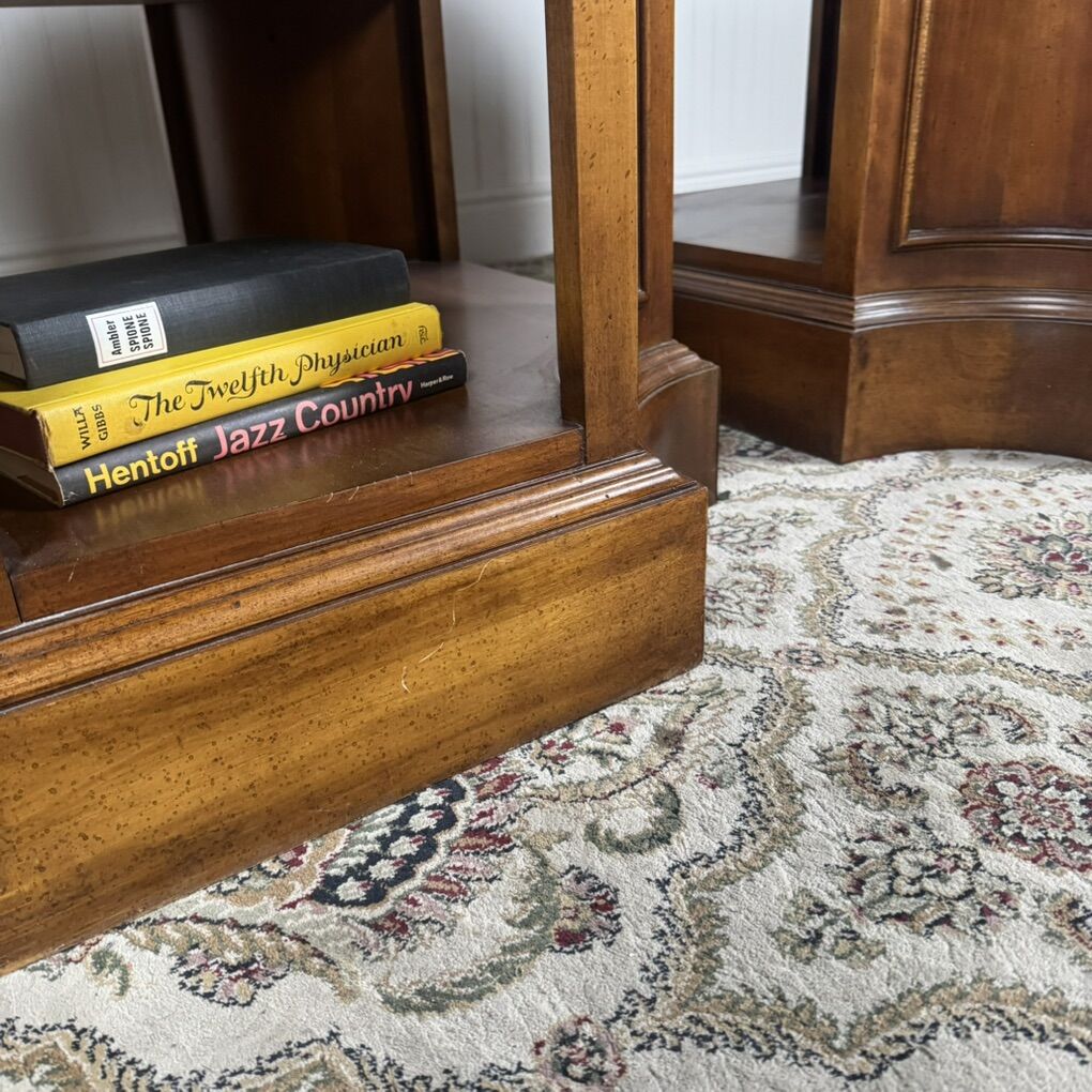 VenmoBeautiful pair of solid wood end tables with rich, warm wood tones and classic paneled detailing. These are substantial pieces with thick tops, sturdy plinth bases, and solid construction.
