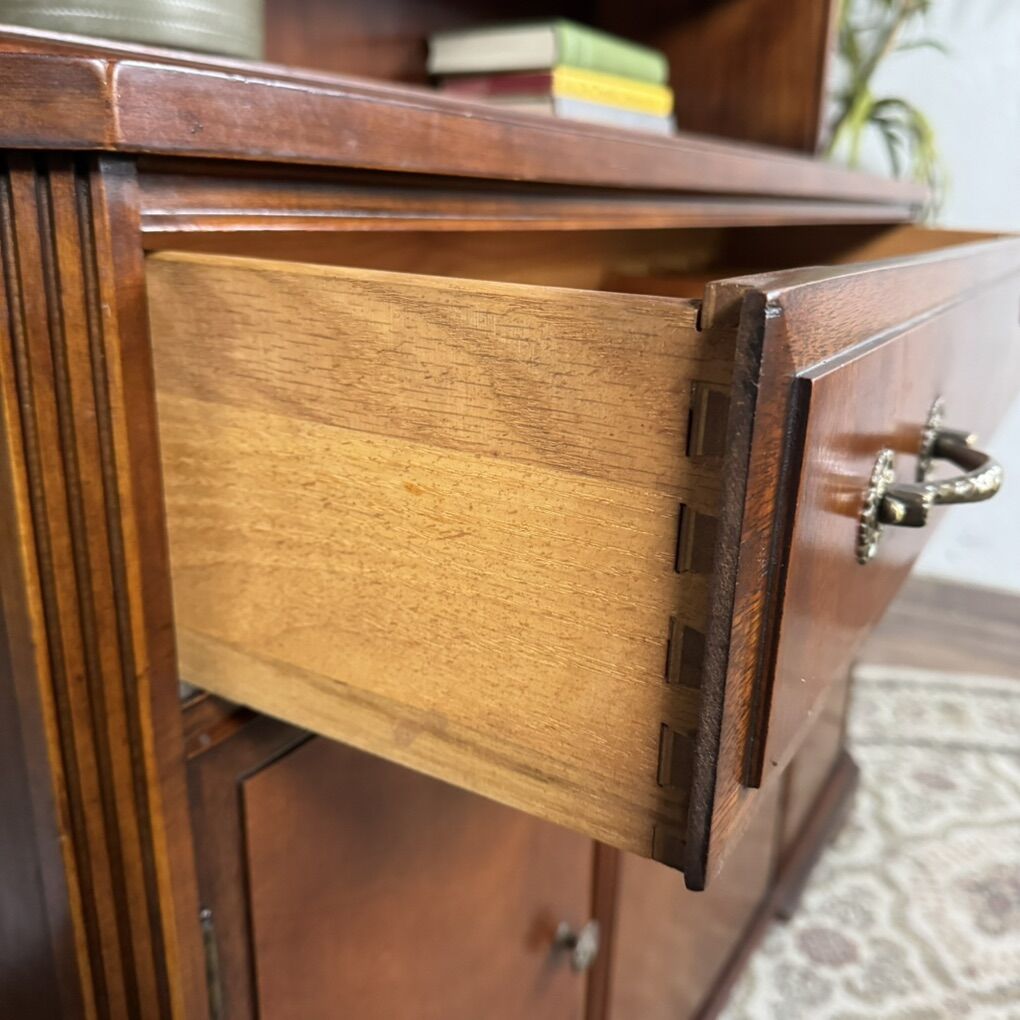 Features authentic machine-cut dovetail drawer joints, original hardware, and ample storage. Some minor signs of wear but overall great vintage condition.