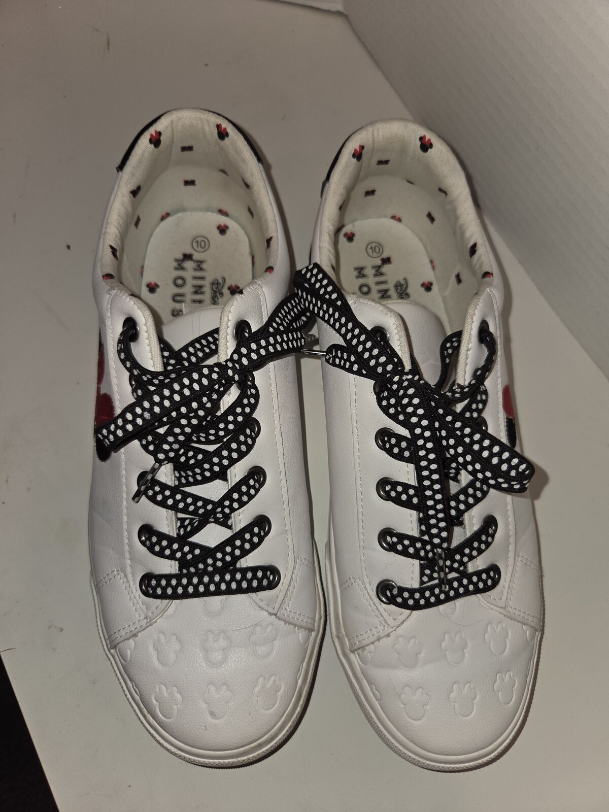 pair of Ground Up Disney Minnie Mouse Women's Low-top Court Sneakers in white faux leather.