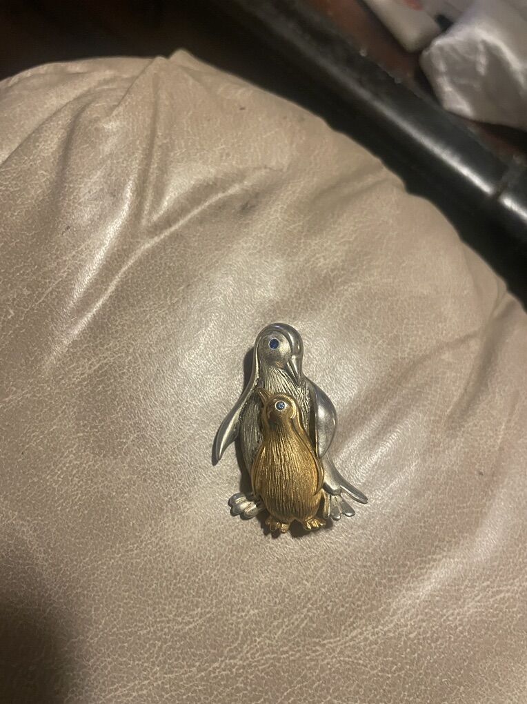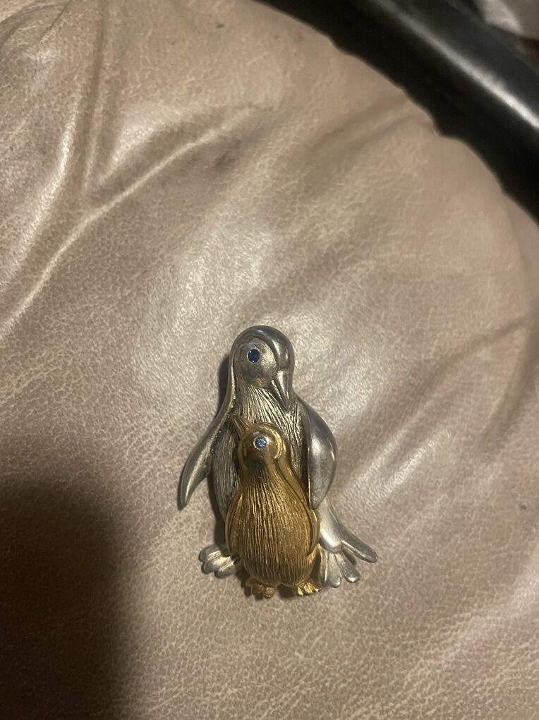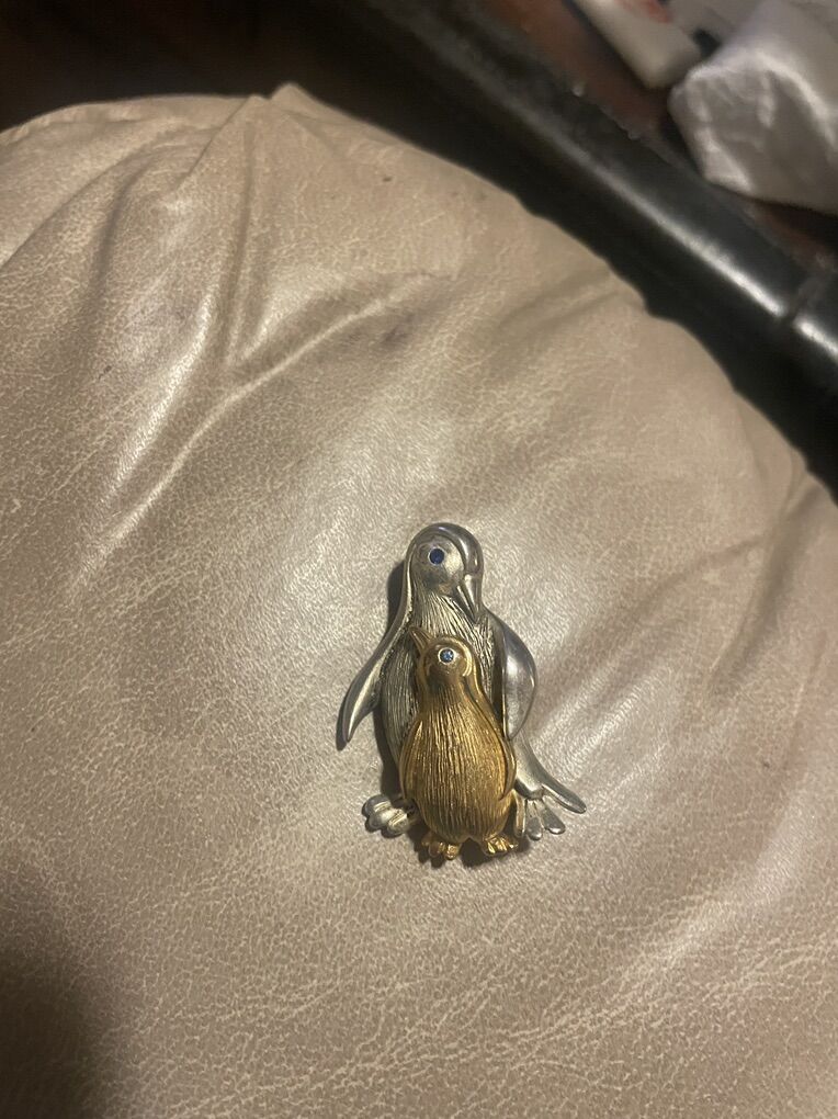 This Vintage signed Vero Penguin, And chick brooch likely made of metal alloy and gold and silver tones and blue Rhinestones. Made with PURE silver and PURE gold! This would make a great Valentines gift.