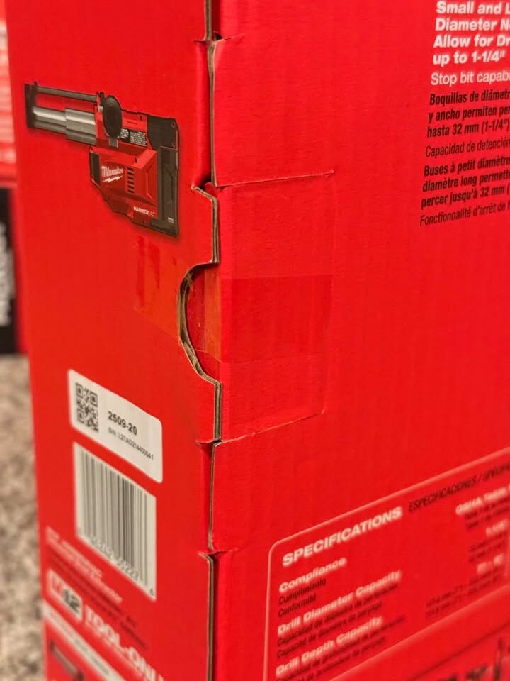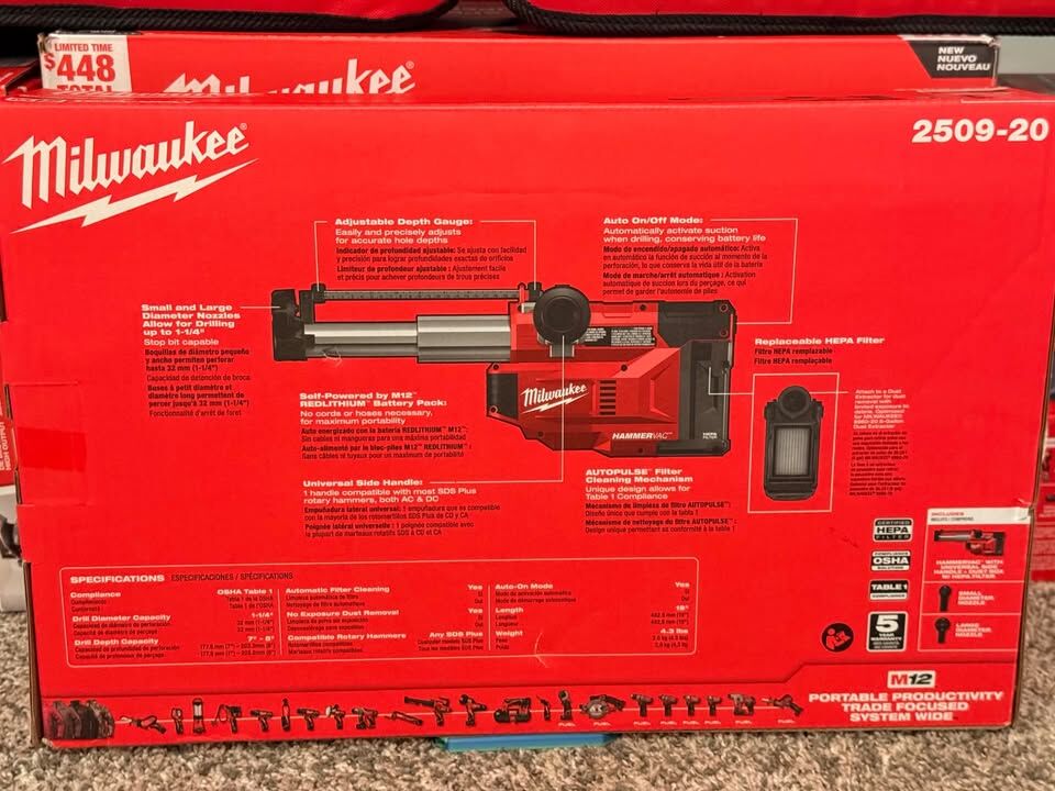 Brand new Milwaukee M12 HAMMERVAC Universal Dust Extractor (model 2509-20). This is the industry's only onboard universal dust extractor that works with any SDS Plus rotary hammer - corded, cordless, Milwaukee or any other brand. The universal side handle design makes it compatible with every SDS Plus hammer on the market, giving you OSHA Table 1 compliant dust-free drilling without needing a separate vacuum system.