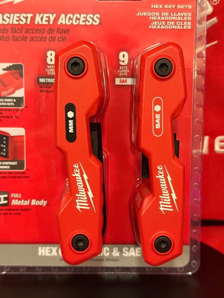 ApplePayBrand new Milwaukee 2-piece 17-key folding hex key set (model 48-22-2183) with both SAE and metric sizes. This is the easiest-access folding hex key set on the market with elevated key shelves and access zones that make grabbing the right size fast and simple. The full metal body construction handles high torque without flexing, and the keys rotate up to 270 degrees for better access and leverage in tight spaces. High-contrast, color-coded markings make identifying the right size easy even in low light.