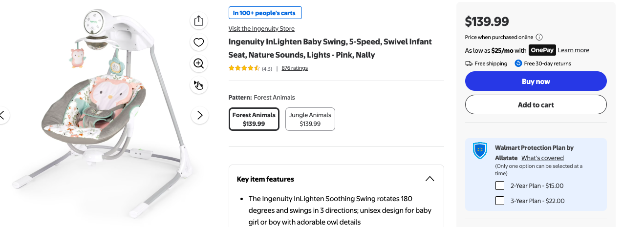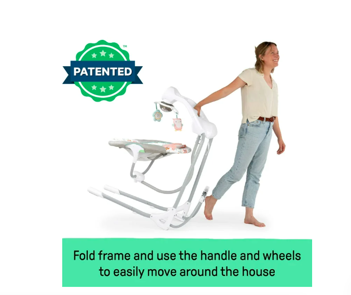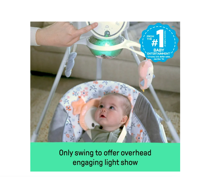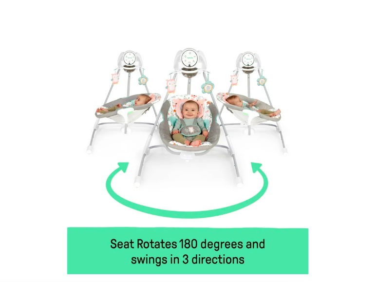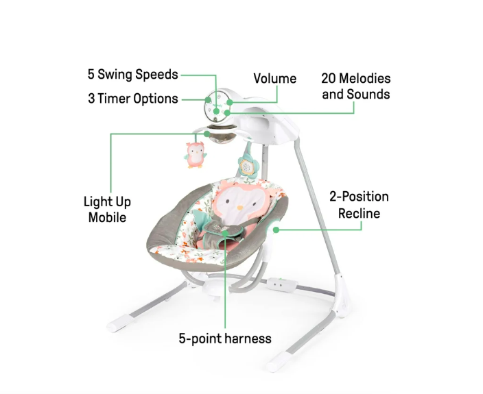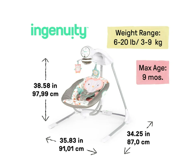 The Ingenuity InLighten Soothing Swing rotates 180 degrees and swings in 3 directions; unisex design for baby girl or boy with adorable owl details