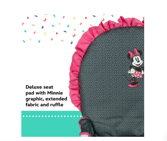 The Disney 3D Ultra High Chair makes mealtimes fun for your little one. It’s easy to stow and take on the go, or you can place it right at your kitchen table with the rest of the family. Built to grow with your child, the full-size tray adjusts to three positions and includes a dishwasher-safe insert for quick and easy cleanup. The deluxe seat pad showcases a cheerful Minnie graphic with extended fabric and ruffle – and it’s simple to wipe down and clean. The high chair folds compact and quick for easy storage in the house or car. Whether dining at home or out and about, the Disney 3D Ultra High Chair is convenient and fun.