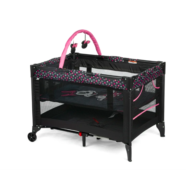 Give your little one a comfortable play and sleep space with the Disney Baby 3D Ultra Play Yard in the Modern Minnie design. The full-size zip-in bassinet provides a safe, cozy spot for newborn rest, while the breathable mesh sides allow clear visibility and airflow. When it’s playtime, the unit converts into a full-sized play yard equipped with a detachable toy bar featuring two plush Disney-themed toys. Built-in wheels make moving the yard from room to room easy, and the compact fold with carry bag ensures hassle-free travel or storage. With a firm, flat sleeping surface that meets safety recommendations and a design that grows from naps to play, this play yard blends whimsy, functionality and convenience for modern families.