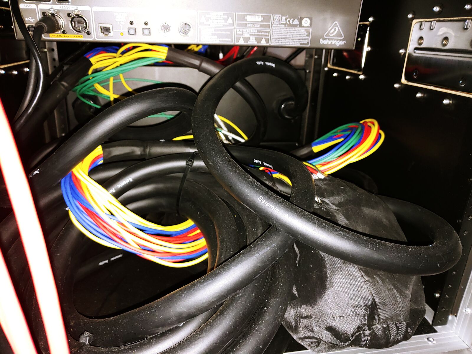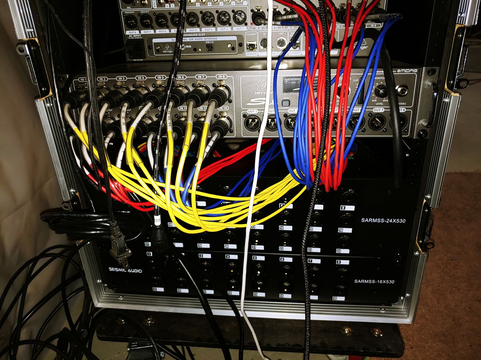 One Seismic Audio SARMSS 24x530 and one Seismic Audio SARMSS 16x530 combo snakes each with a 30 foot XLR snake to plug in to Front of House