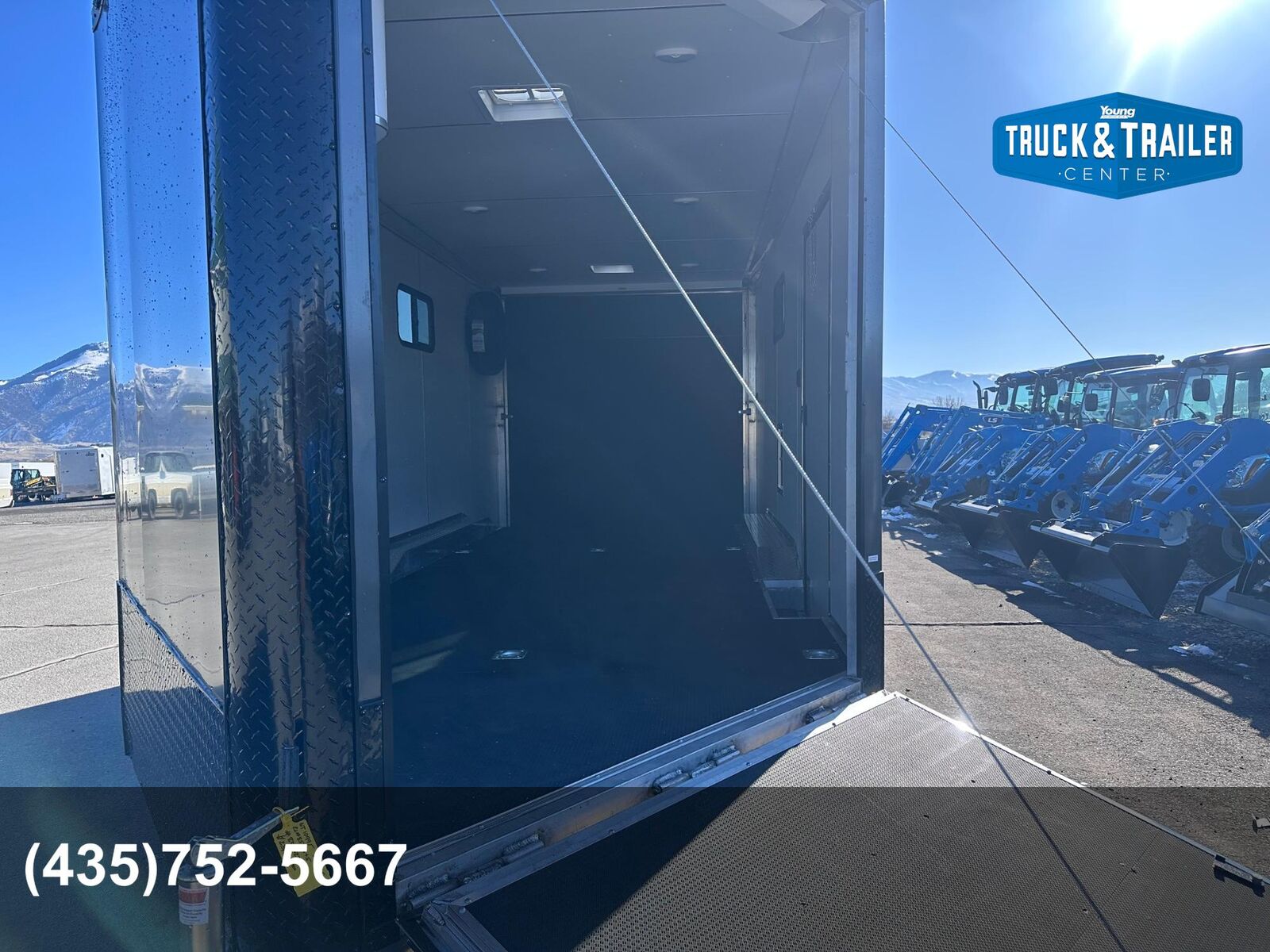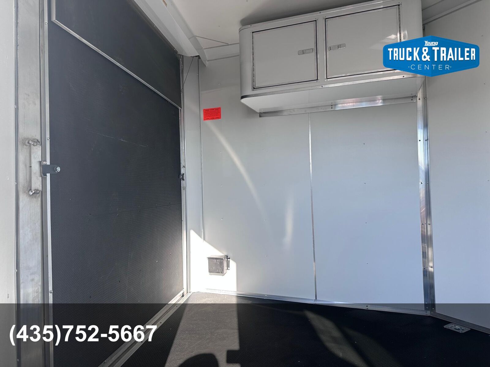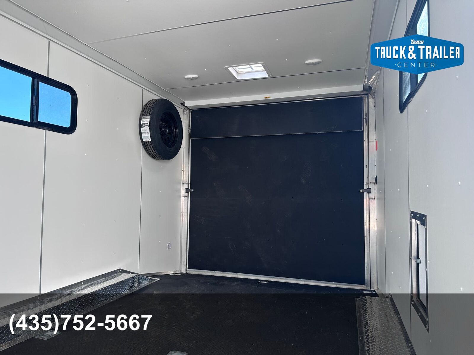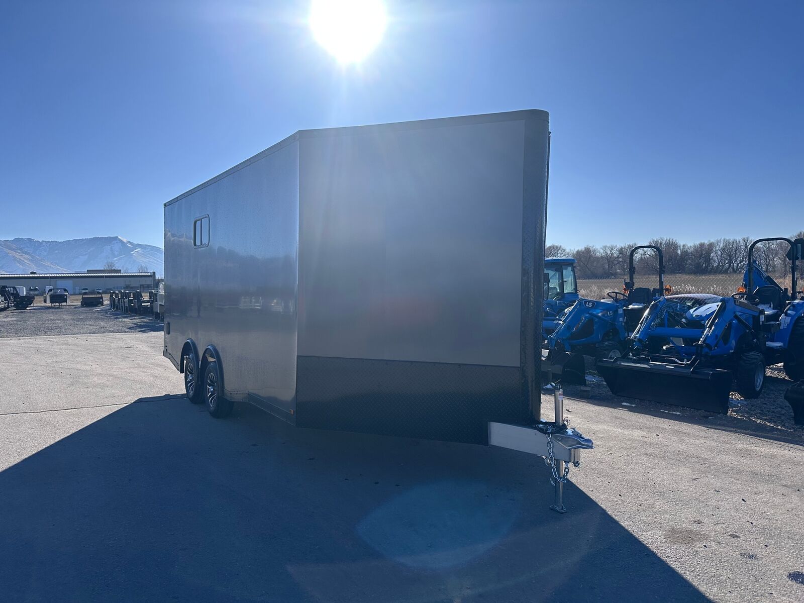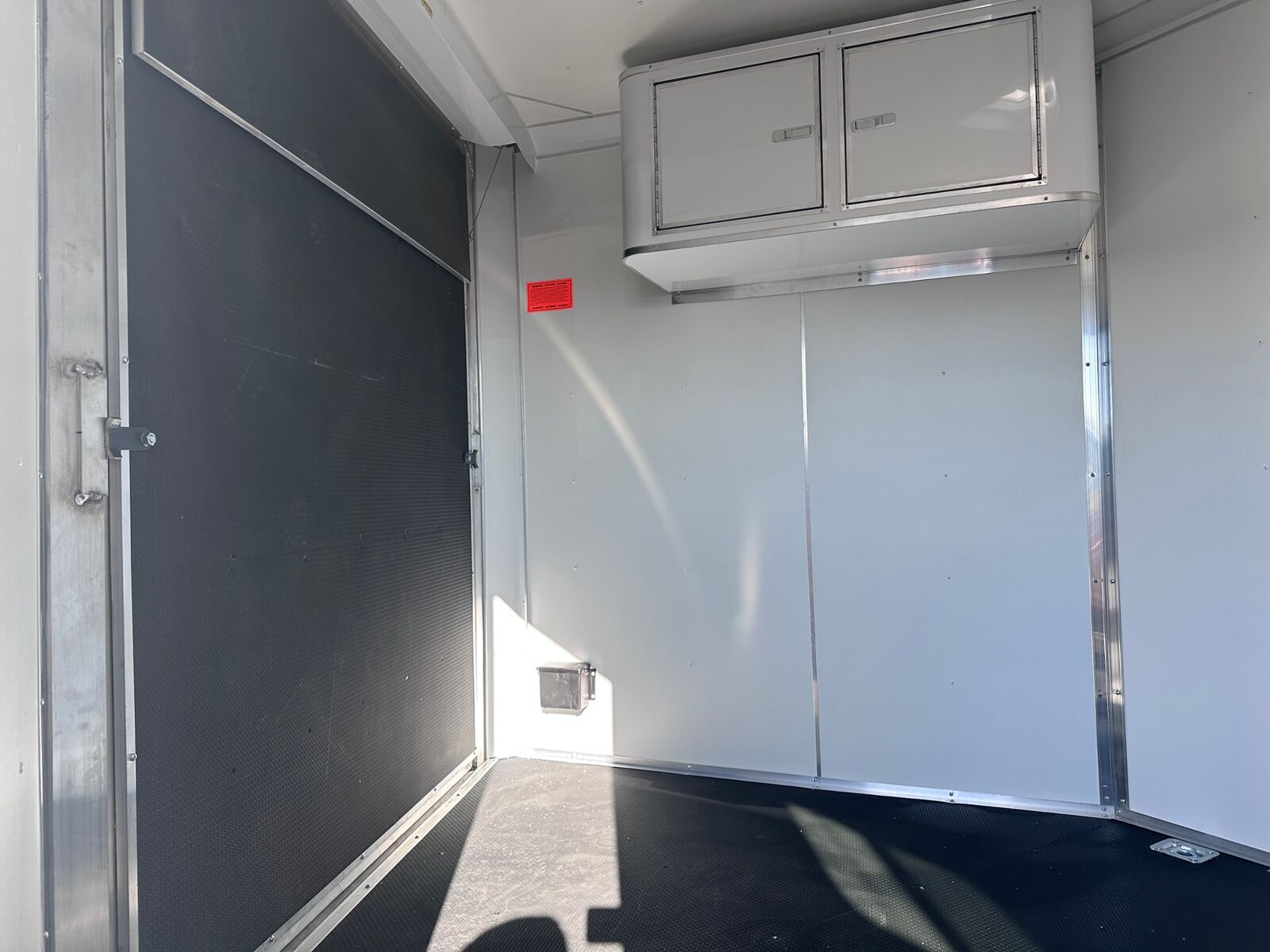 18' Box 5' V-nose Front and Rear Ramp Doors 5K Torsion Axles All Aluminum Frame White Walls and Ceiling Insulated Walls and Ceiling Poly Bead Flooring Windows Front Cabinet 9 D-Rings in Floor Drive Over Fenders Spare Tire and Wall Mount