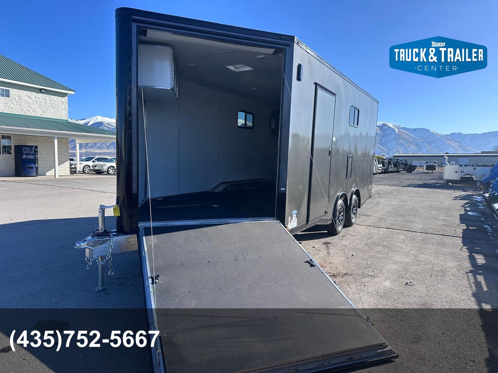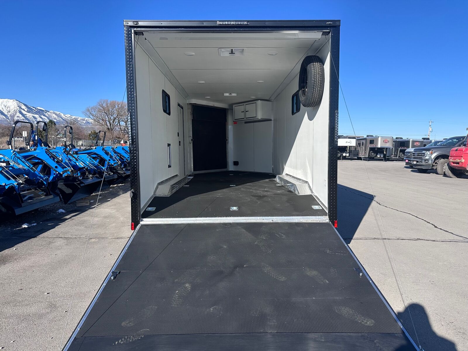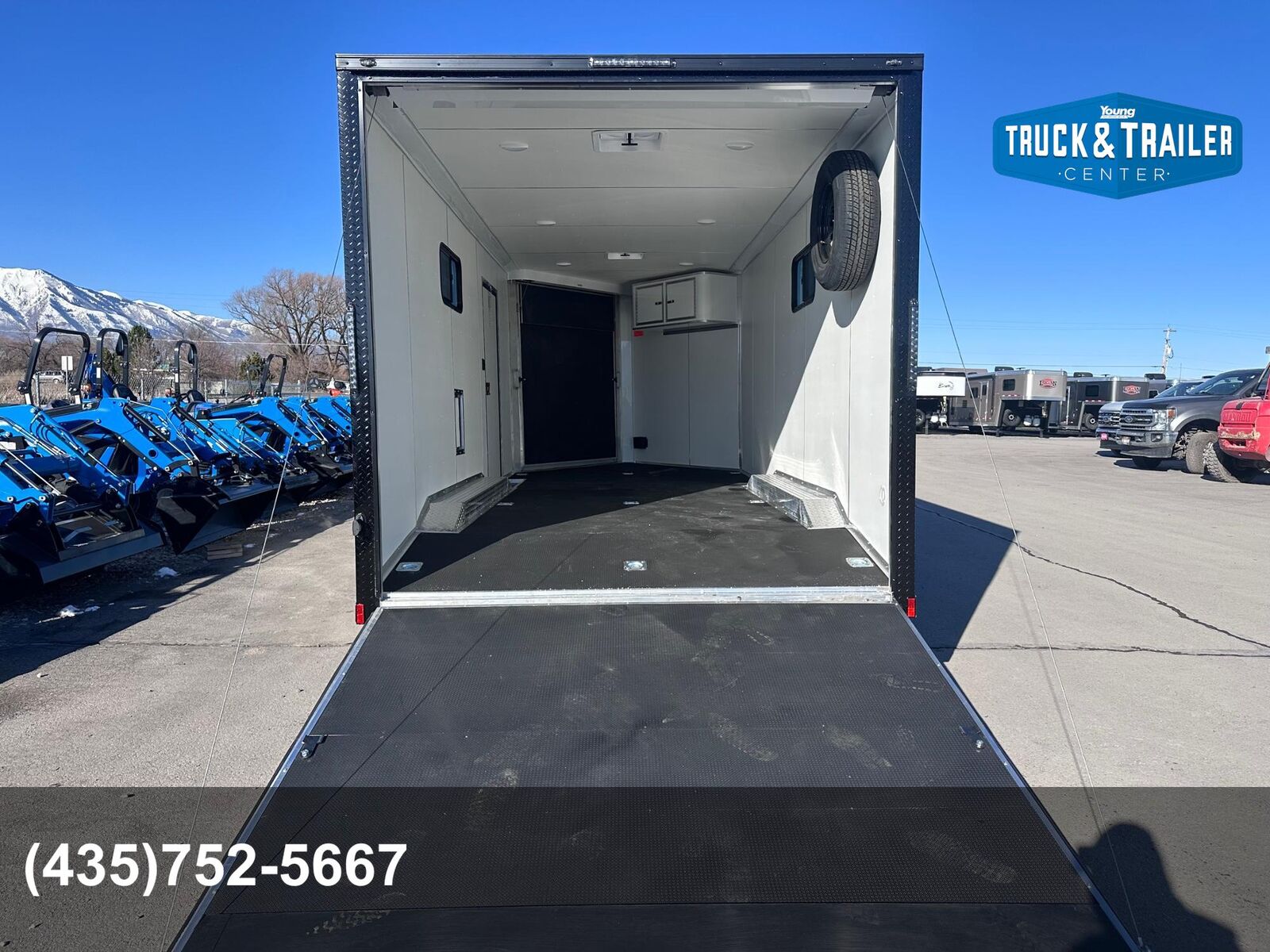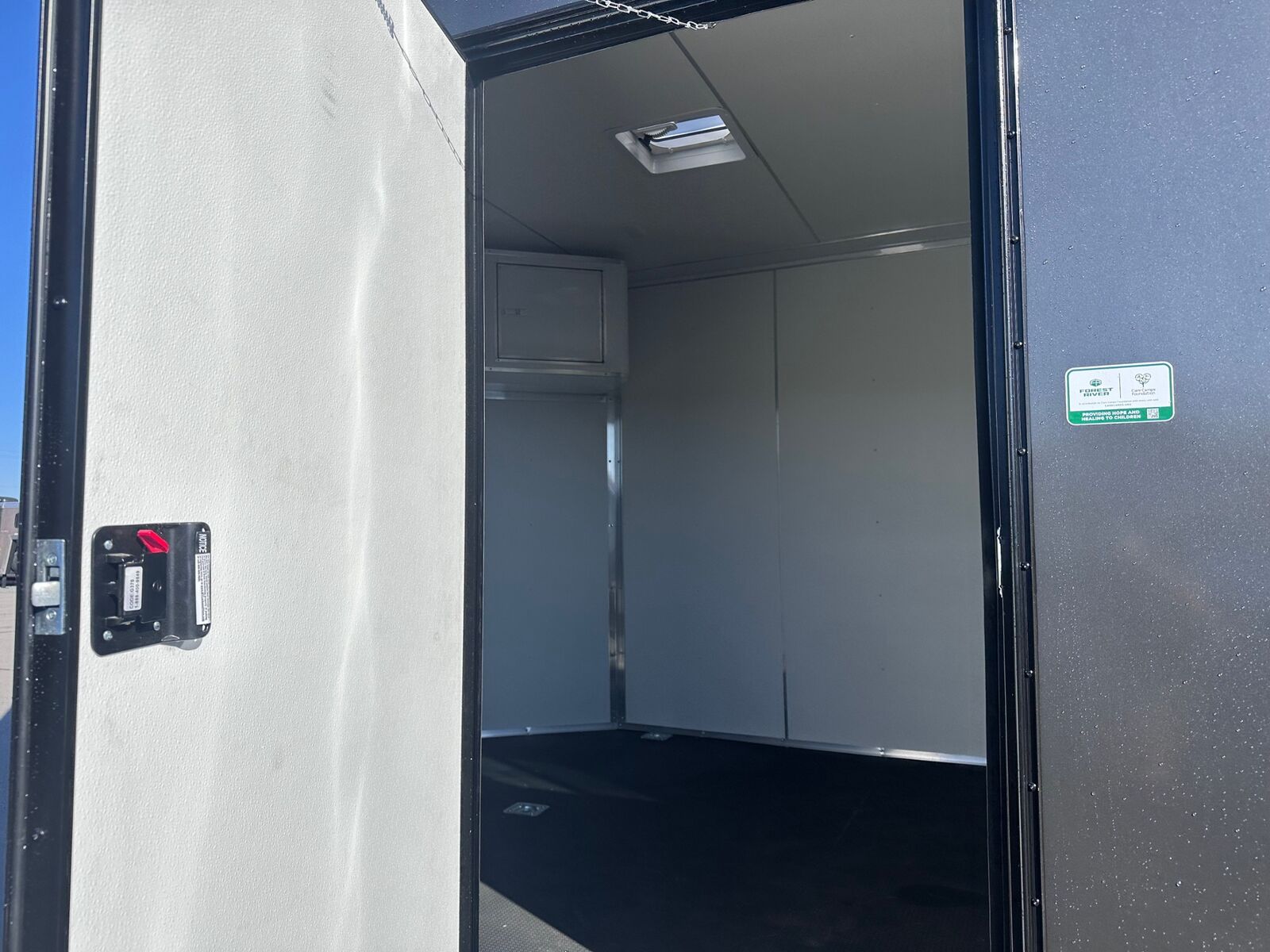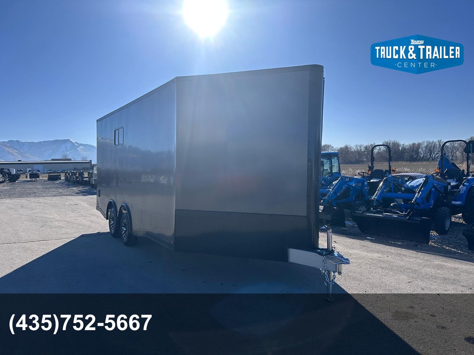 18' Box 5' V-nose Front and Rear Ramp Doors 5K Torsion Axles All Aluminum Frame White Walls and Ceiling Insulated Walls and Ceiling Poly Bead Flooring Windows Front Cabinet 9 D-Rings in Floor Drive Over Fenders Spare Tire and Wall Mount