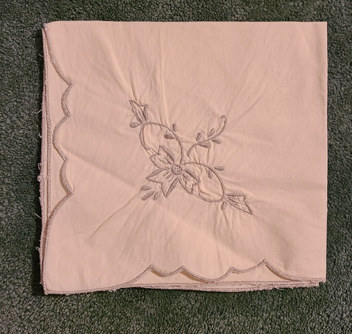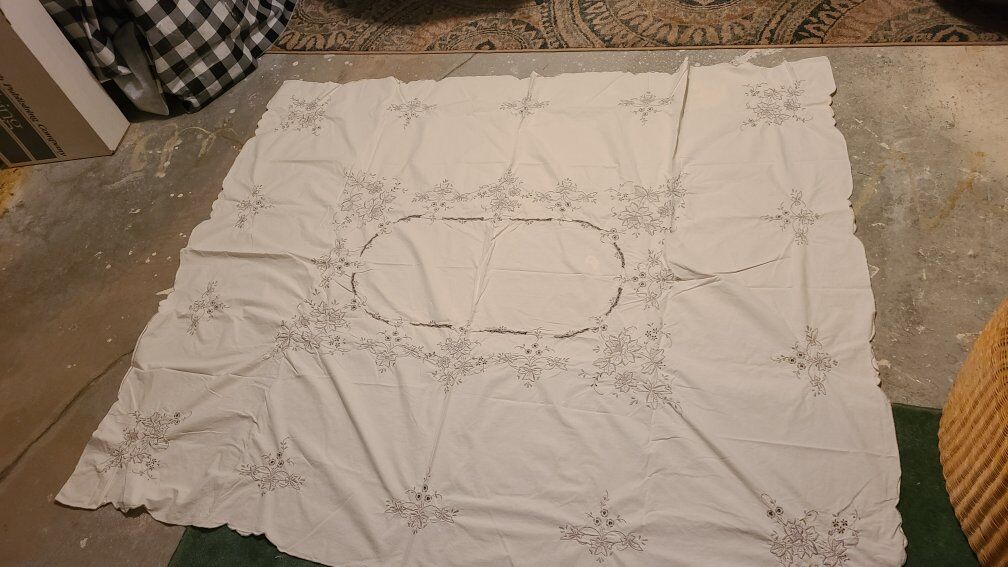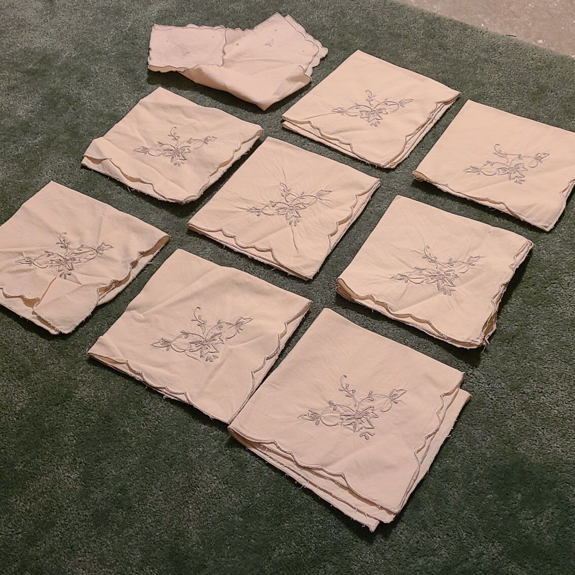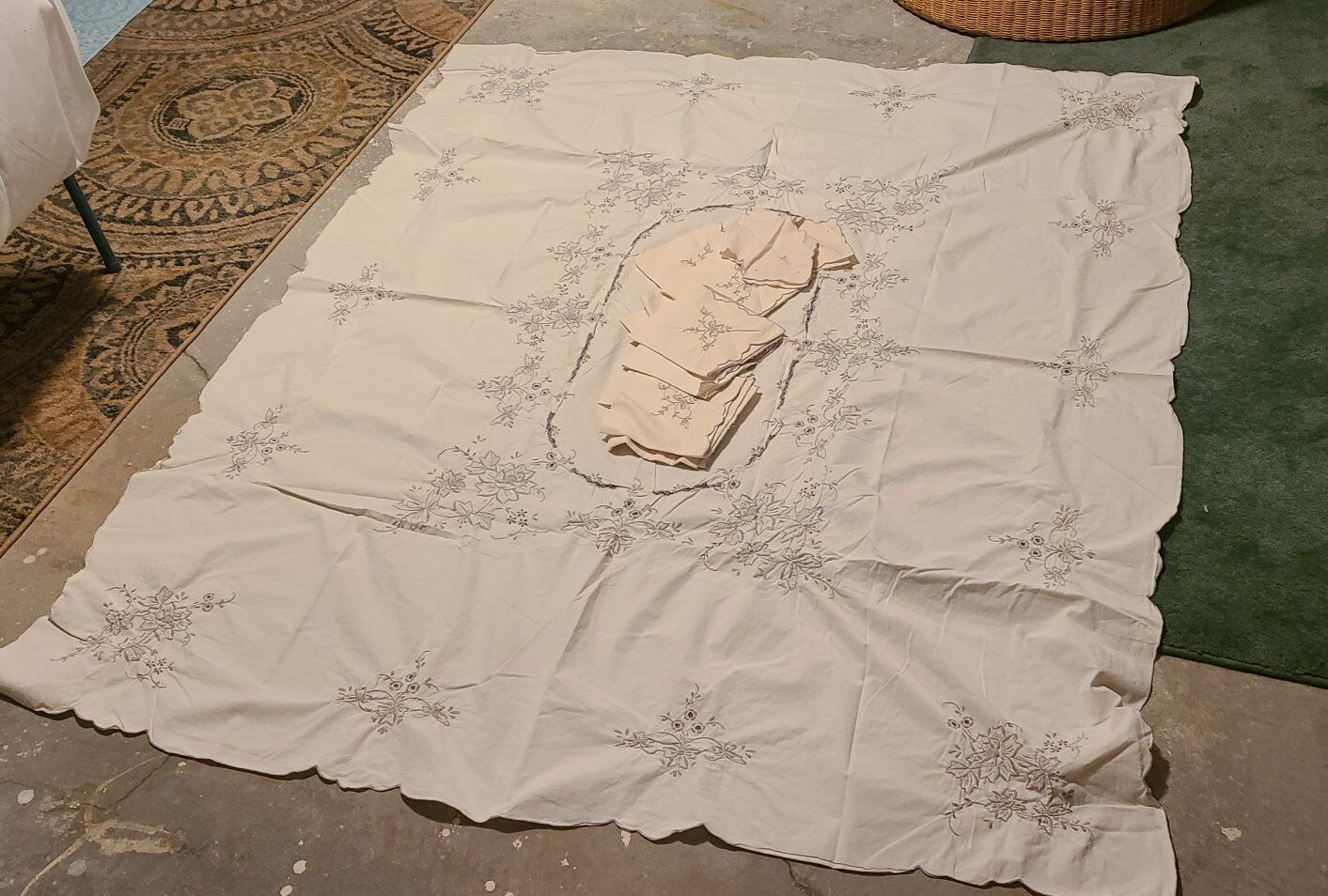 Beautiful embroidered napkins and tablecloth 75x65 Vintage - some discoloration from age.