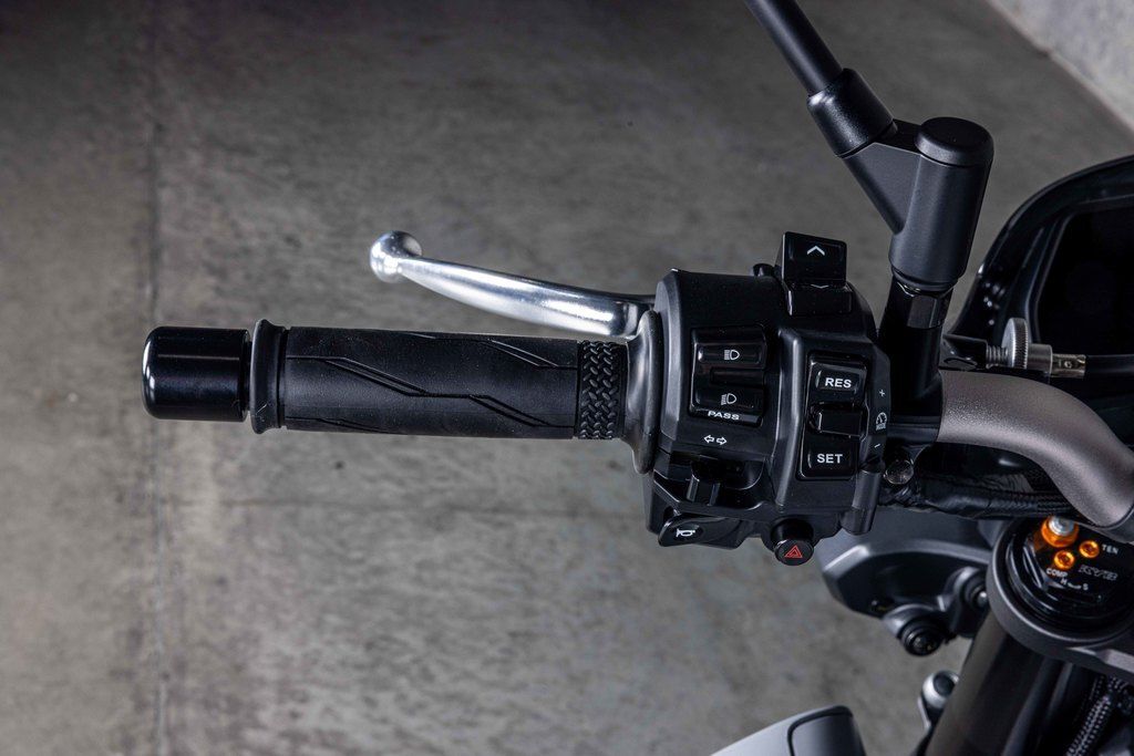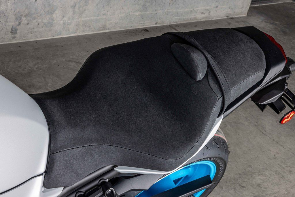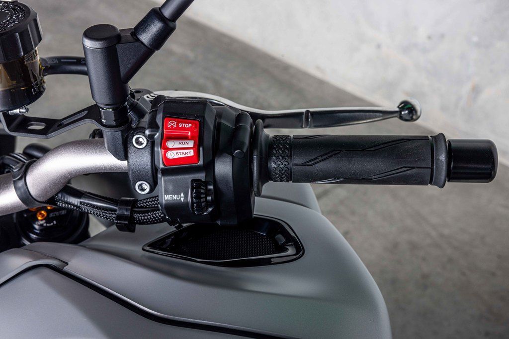 A stripped-down look is achieved by removing unnecessary bodywork elements and refocusing attention on the pure mechanical beauty of the muscular engine and compact frame. Twin-eye mono-focus LED headlights and LED position lights situated above the headlights combine with a compact nose assembly to minimize overhang and lend a refined, dominant style. Enlarged, functional intake ducts mounted on either side of the fuel tank cover increase efficiency while further enhancing the bike's aggressiveness.