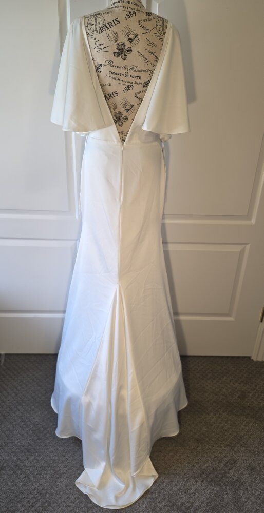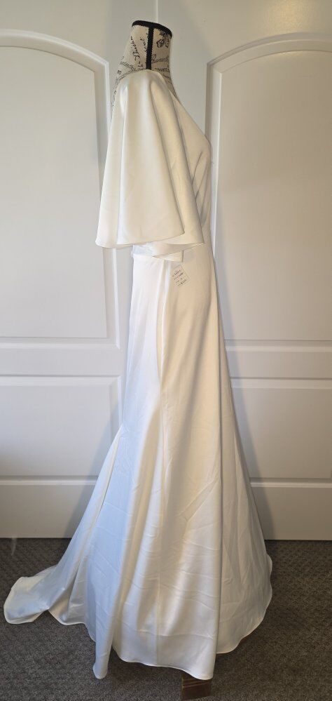 VenmoThis dress is identified as the Camilla Gown by designer Sarah Seven. It is a sleek satin wedding dress featuring a V-neckline, fitted skirt, short train, and distinctive fluttery mid-length sleeves. The gown has been tried on in stores and is available from various bridal retailers online, including Adinas Bridal and Luxe Redux Bridal, with prices varying.