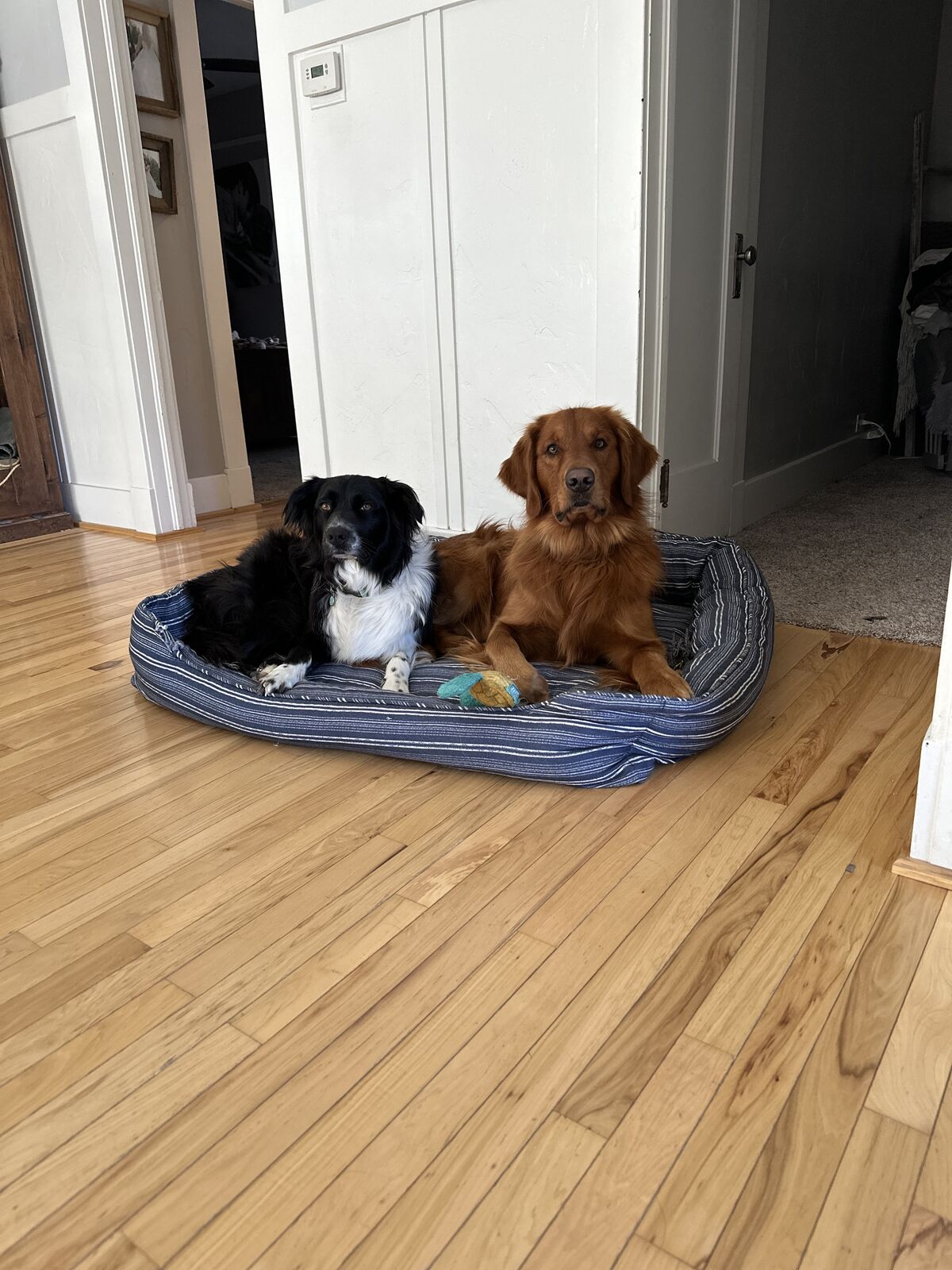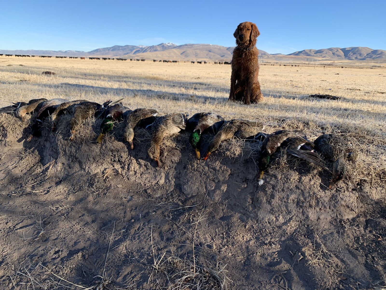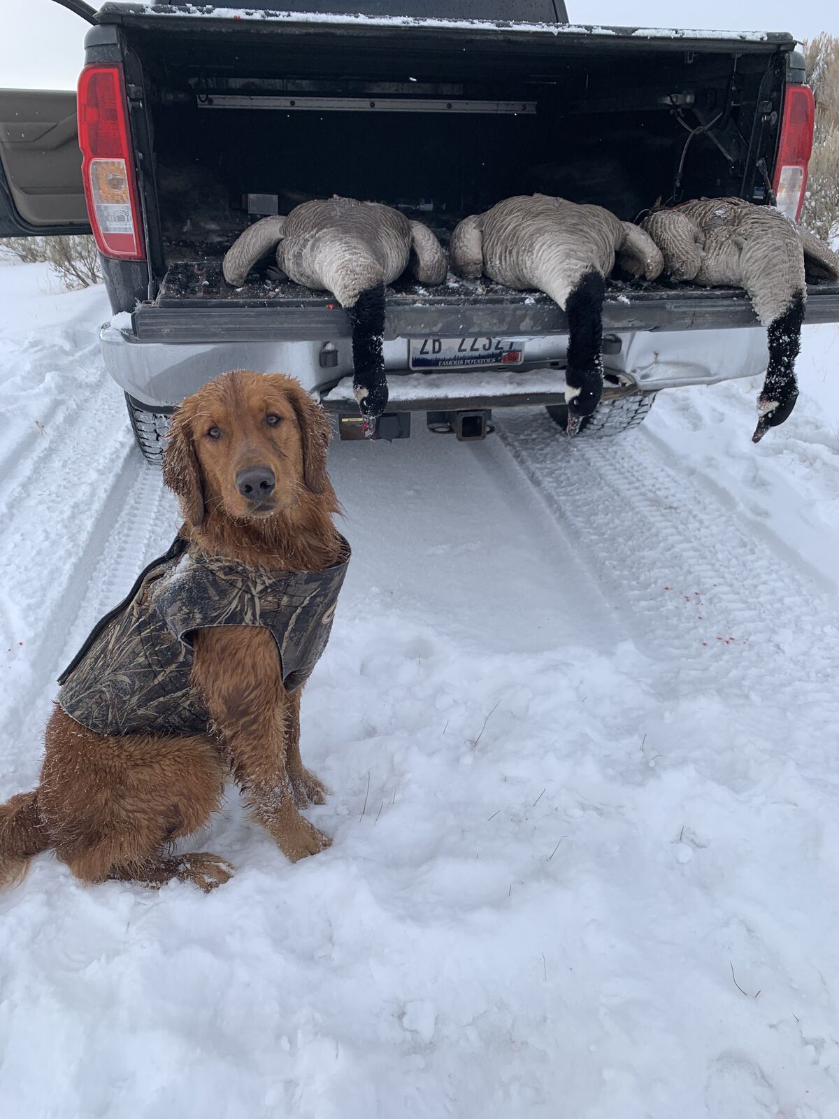 Wrangler is a 95 lb retriever with a red coat and muscular build. He is a great all around dog, house trained, family friendly, and retrieves waterfowl.