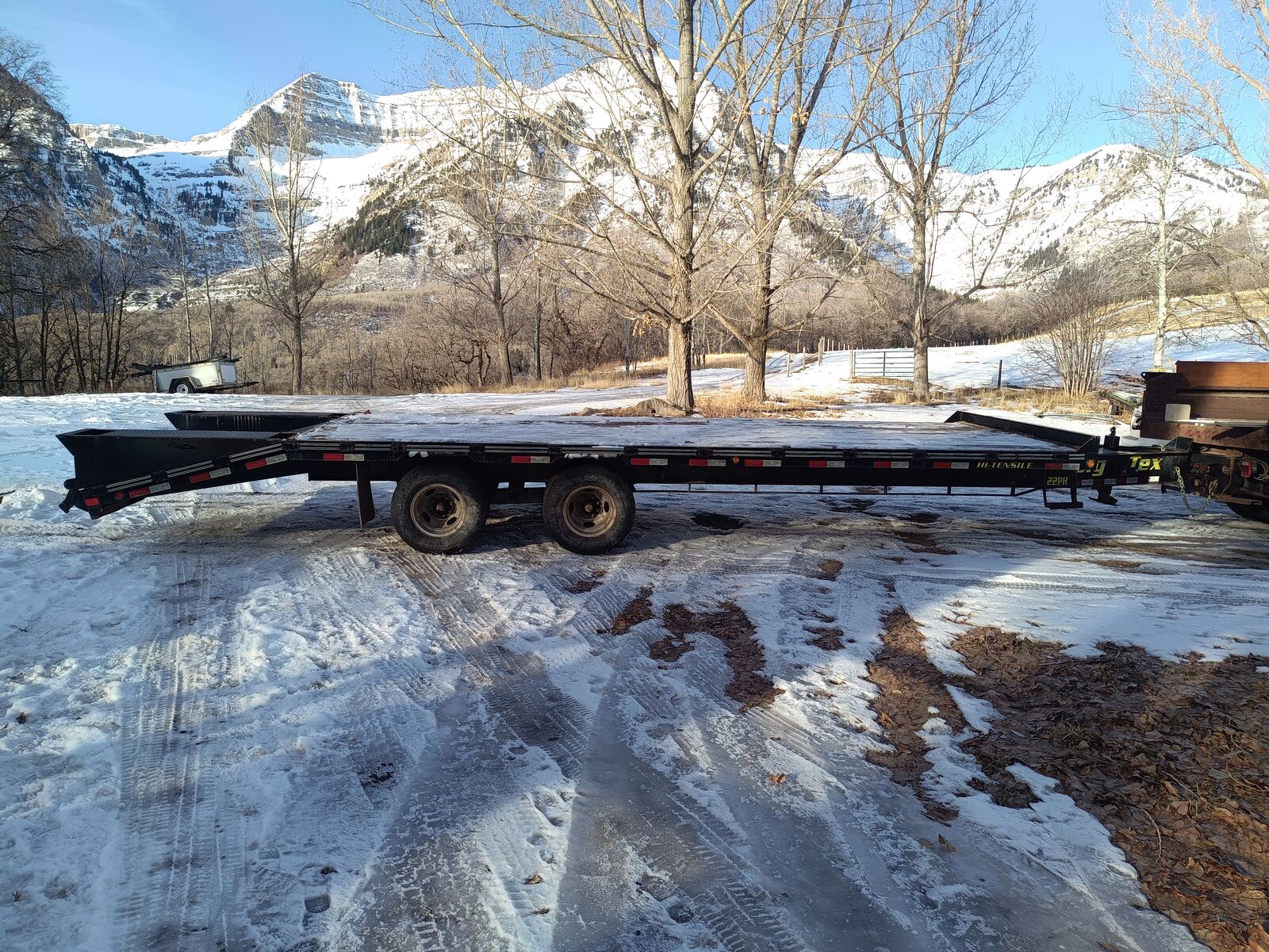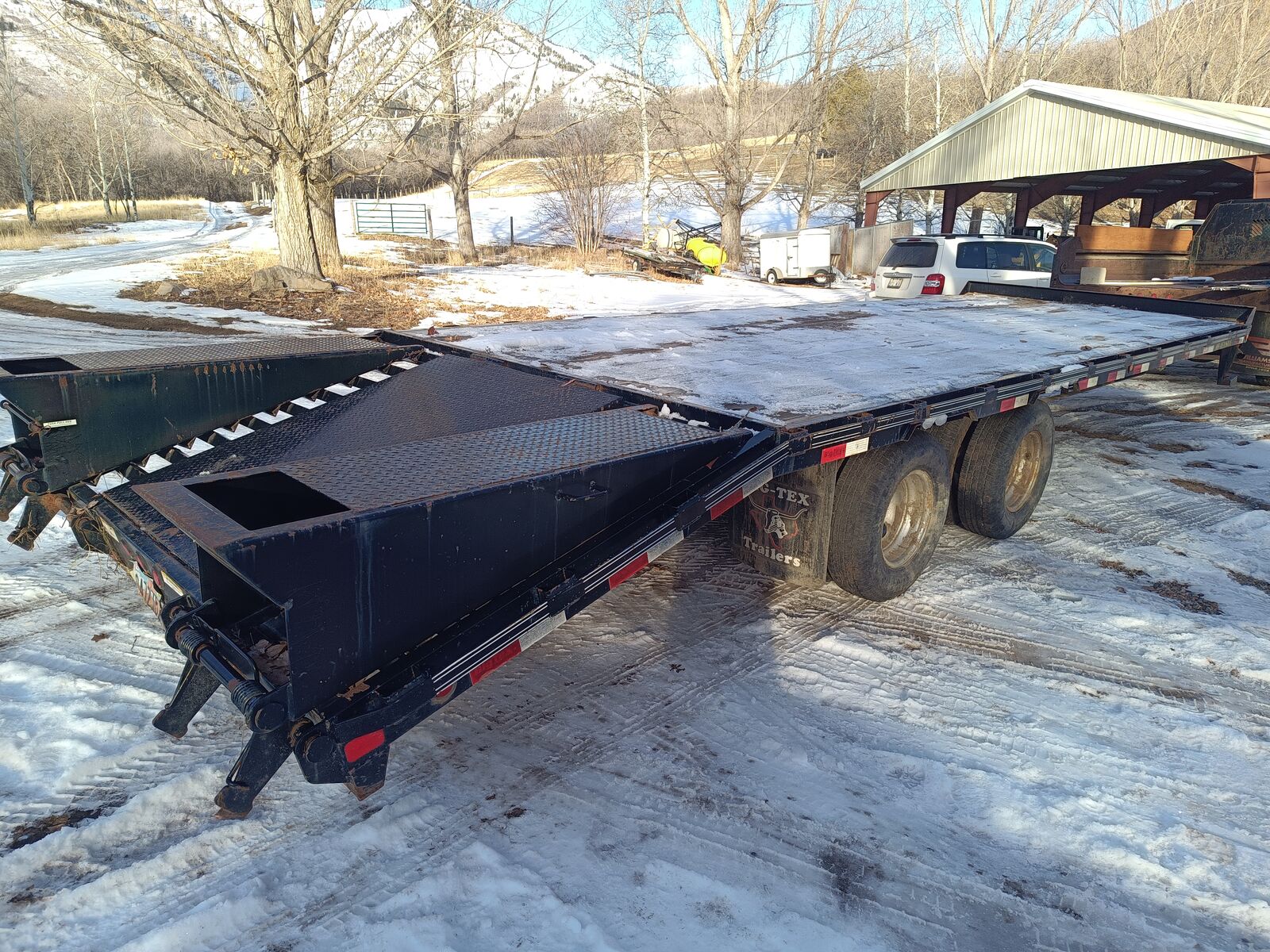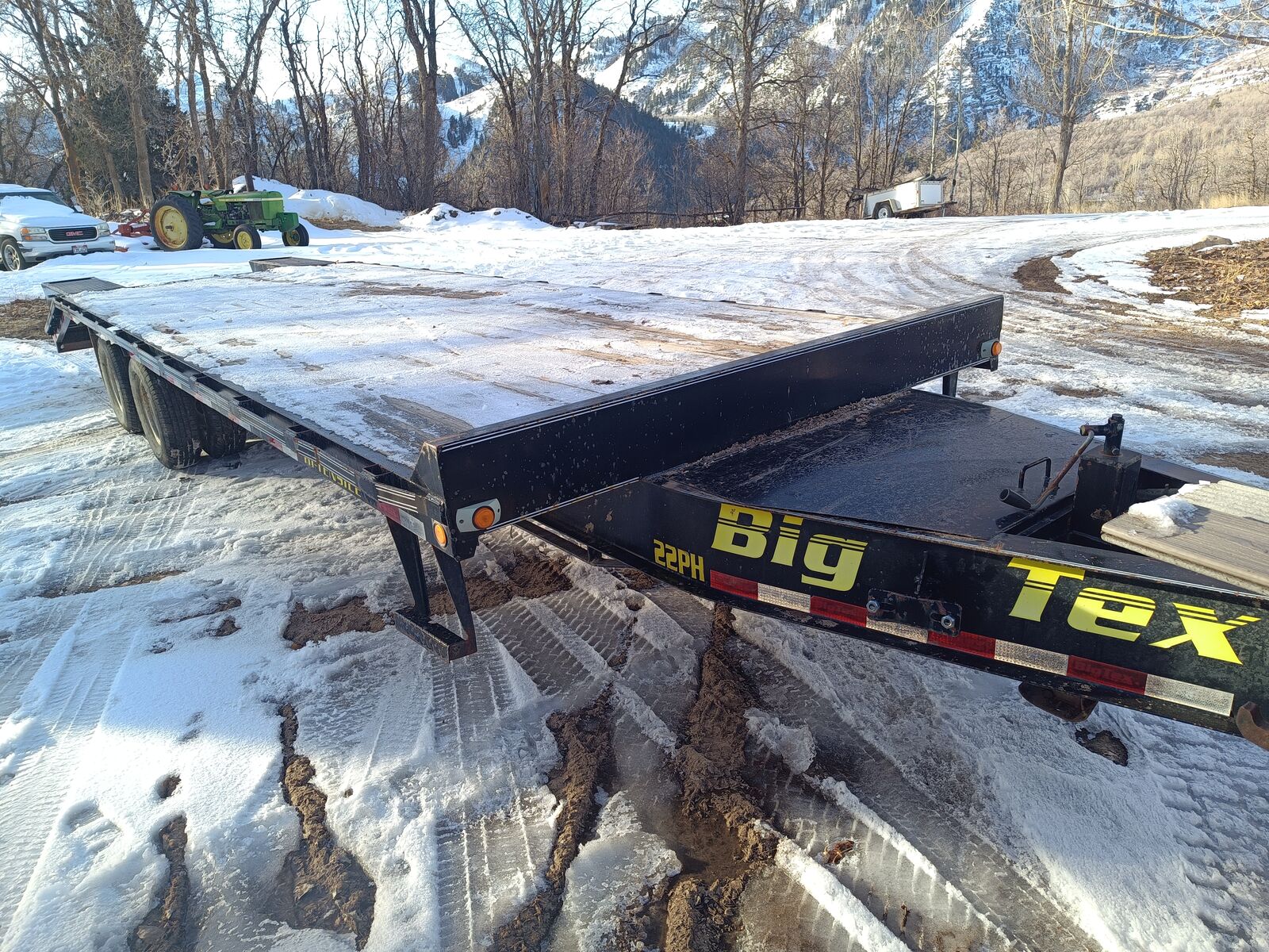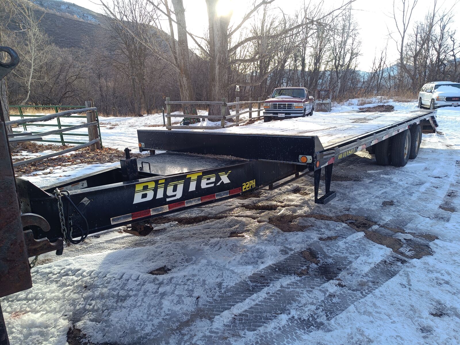 Big Tex 22PH- 22+5 deckover flatbed trailer. 22' deck + 5' dovetail with double hinged, spring assist, fold-over ramps. 102" wide deck. 22,500 GVWR. Dual 10,000 lbs. axels