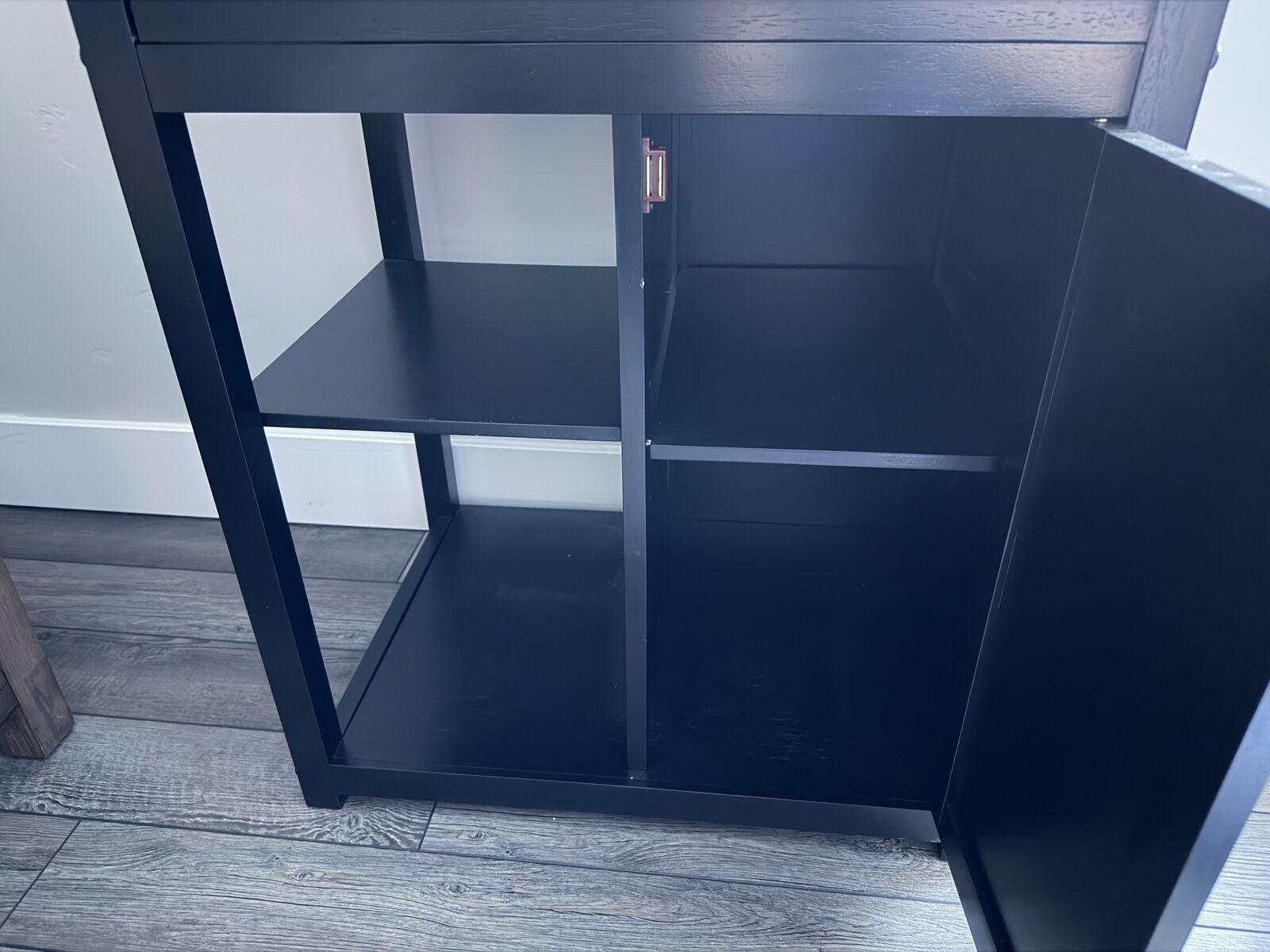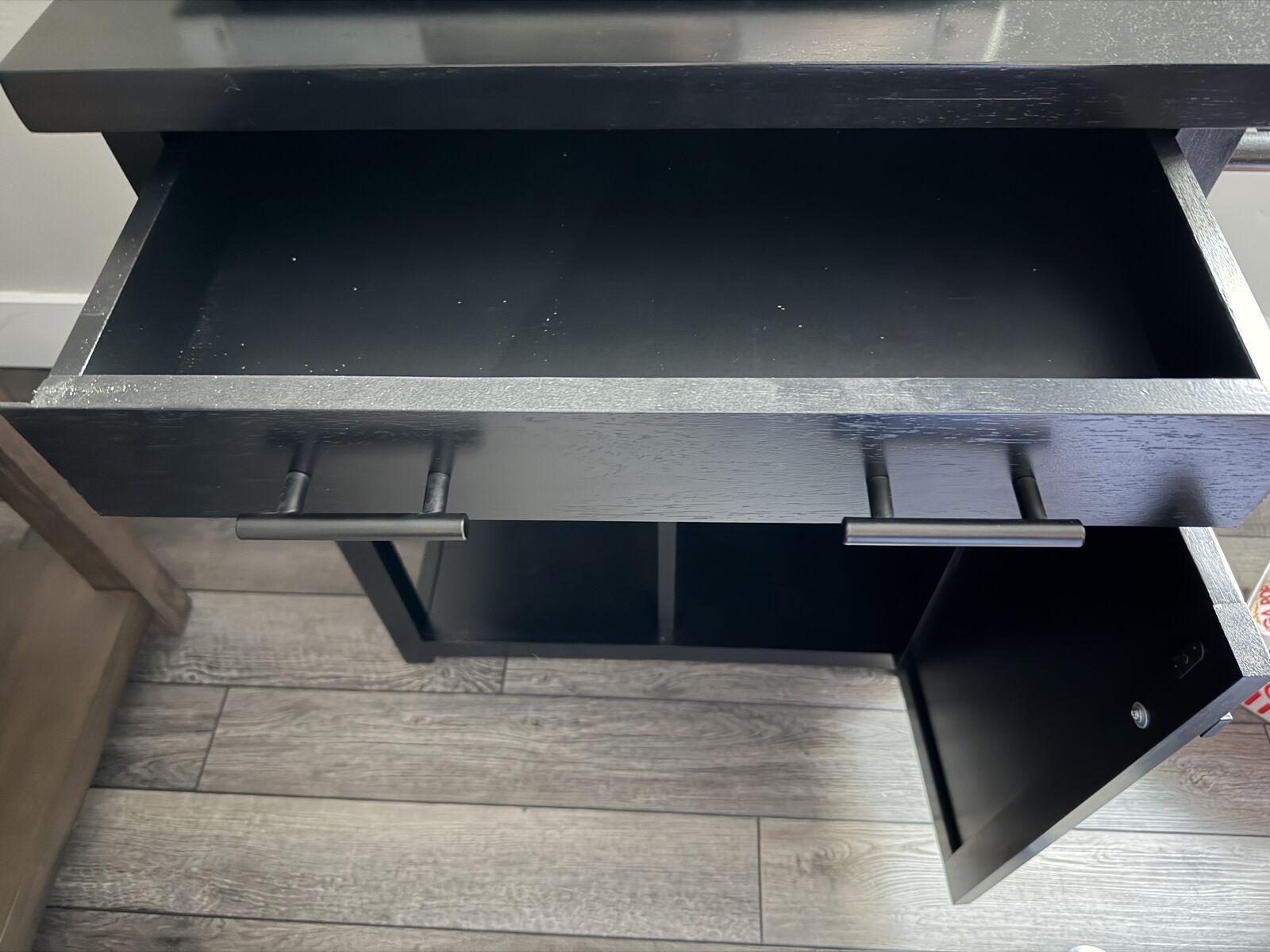VenmoThis is a WINSOME WOOD Timber Black Kitchen Cart with Storage. It features 1 large drawer, two shelves & 1 large storage cabinet. It has a towel bar on the right side for convenience and cleanup. It has wheels for easy use and transport with 2 locking castors. It is functional but also aesthetically pleasing for any room. It has wainscoting panels on the cabinet which adds great style and appeal. It also has 2 black modern drawer handle pulls and a square cabinet knob for extra style. This storage cart is perfect for use in a kitchen, pantry, game room, family room, wet bar area or any room needing extra storage.