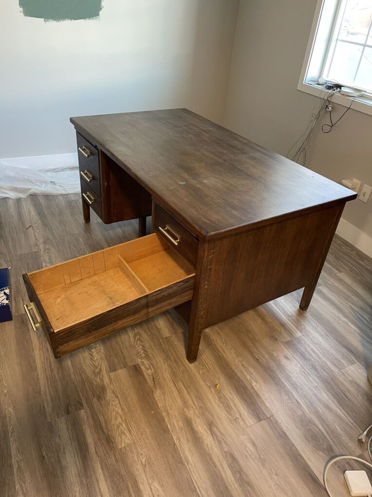 VenmoWe are selling this mid-century modern classic Solid Oakwood desk. They literally don’t them like they used to with this desk. Super deep drawers and holds a ton. Has been a great desk for the last few years and show signs of where but it’s super easy to refinish because again it is solid wood and not a veneer. Upgraded the hardware after we bought it and have loved it. Just redoing our office with a built in desk now and need to sell this so we have room ha.
