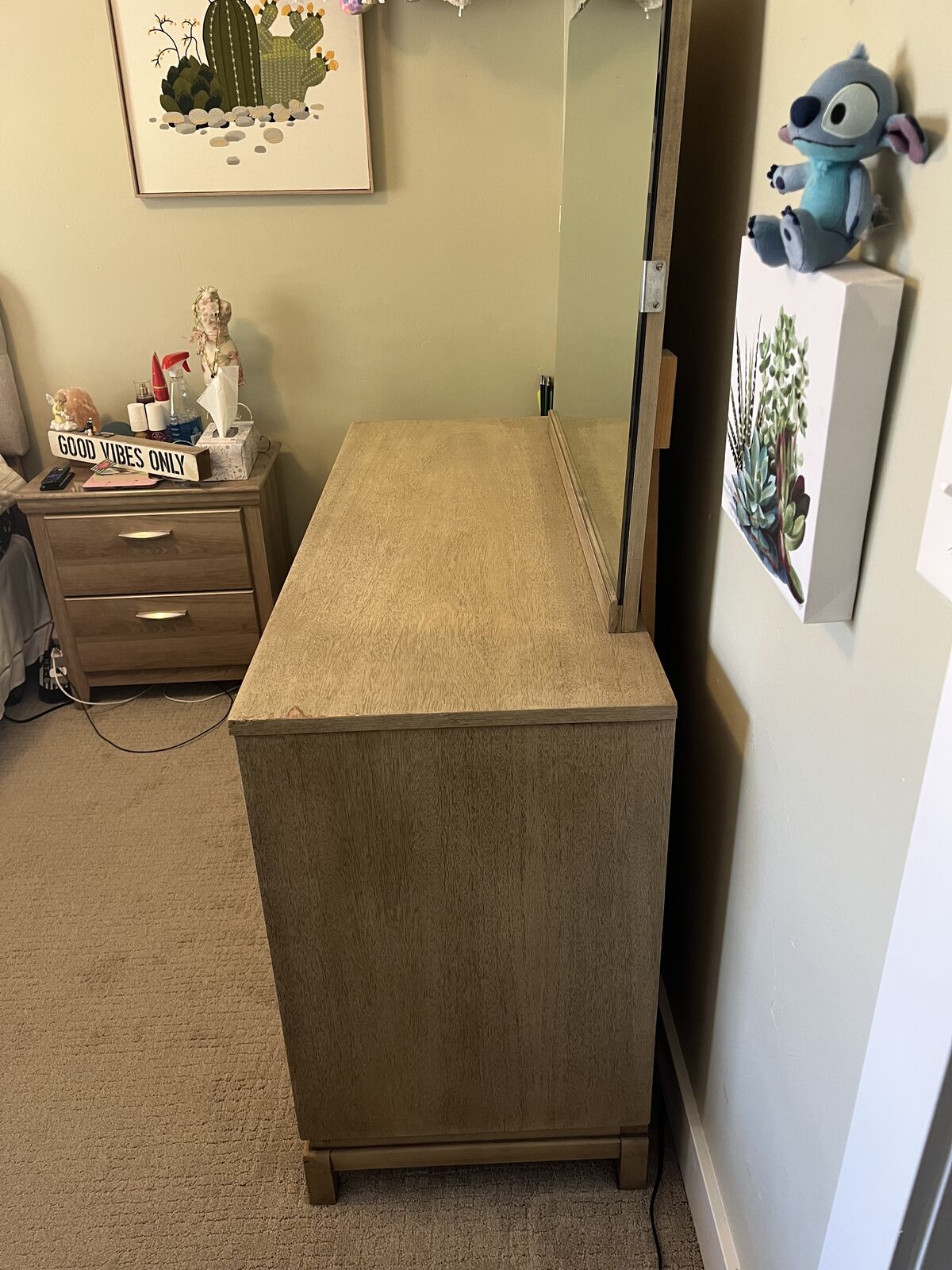 VenmoCute Mid-Century modern dresser with 7 drawers. Sturdy, well-made dresser. All the drawers work great. There is some wear on the top as shown in the picture. Dimensions 52 wide x 19 deep x 32 high. With the mirror it is 61 high.