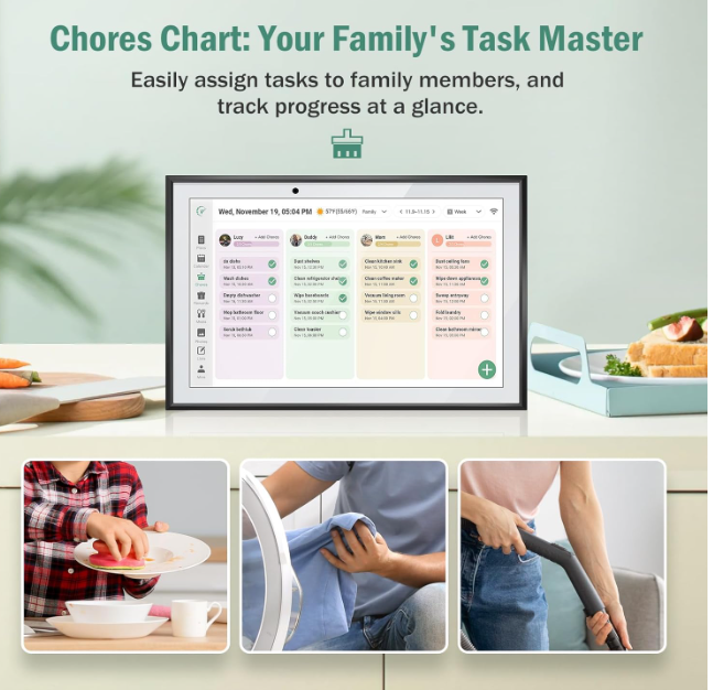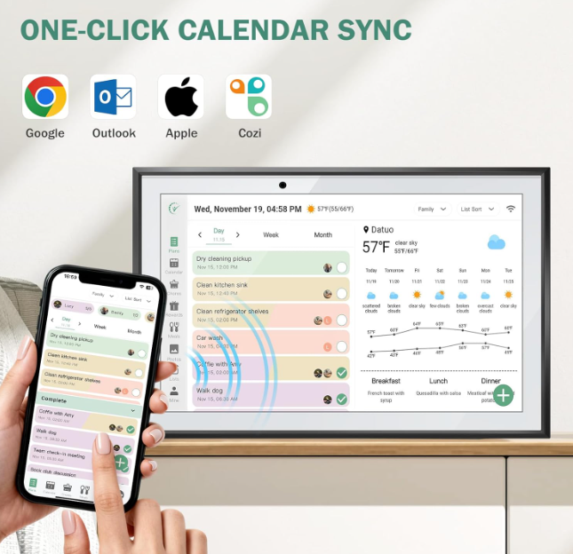 ZelleOne to Multi-Account and Two - way Synchronization: The smart calendar allows one device to link with all family members' phone accounts. It features two-way sync. On the device, it instantly shows events added by each member on their apps. Meanwhile, all family members' arrangements on device are updated on their apps in real time.
