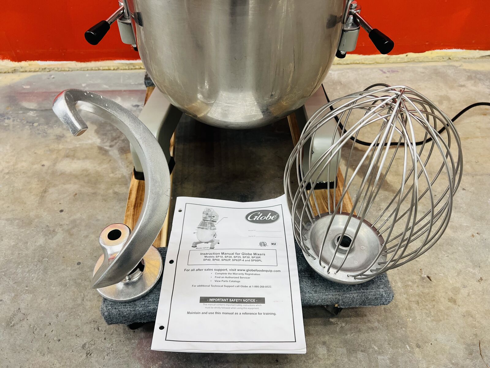 Comes with 20-quart stainless steel bowl, owners manual and (3) attachments.