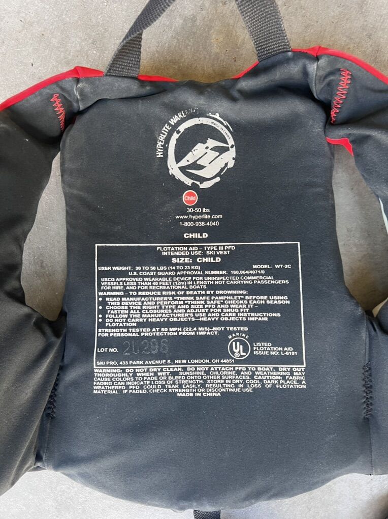 VenmoGreat condition Hyperlite kids life jacket, fits 30–50 lbs. Bright red color, super comfy, and Coast Guard approved for safety. Has zipper and buckle straps that all work perfectly. Perfect for boating, tubing, or swimming — ready for summer fun!