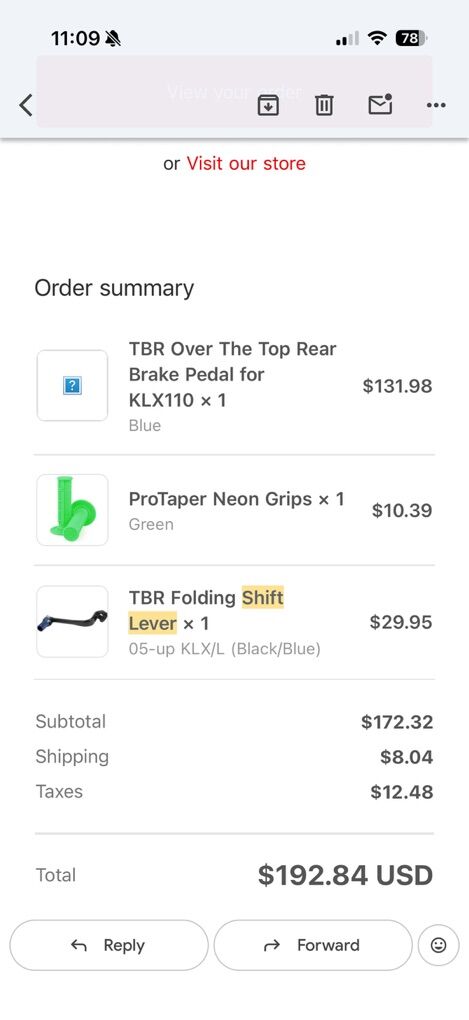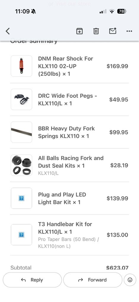 Upgrades -pro taper handle bar kit -heavy duty fork springs -damping rods -fork dust seals -led light bar -wide foot pegs -rear shock (250 lb) -TBR brake pedal -TBR folding race shift lever -new tires (less than 5 miles on them)