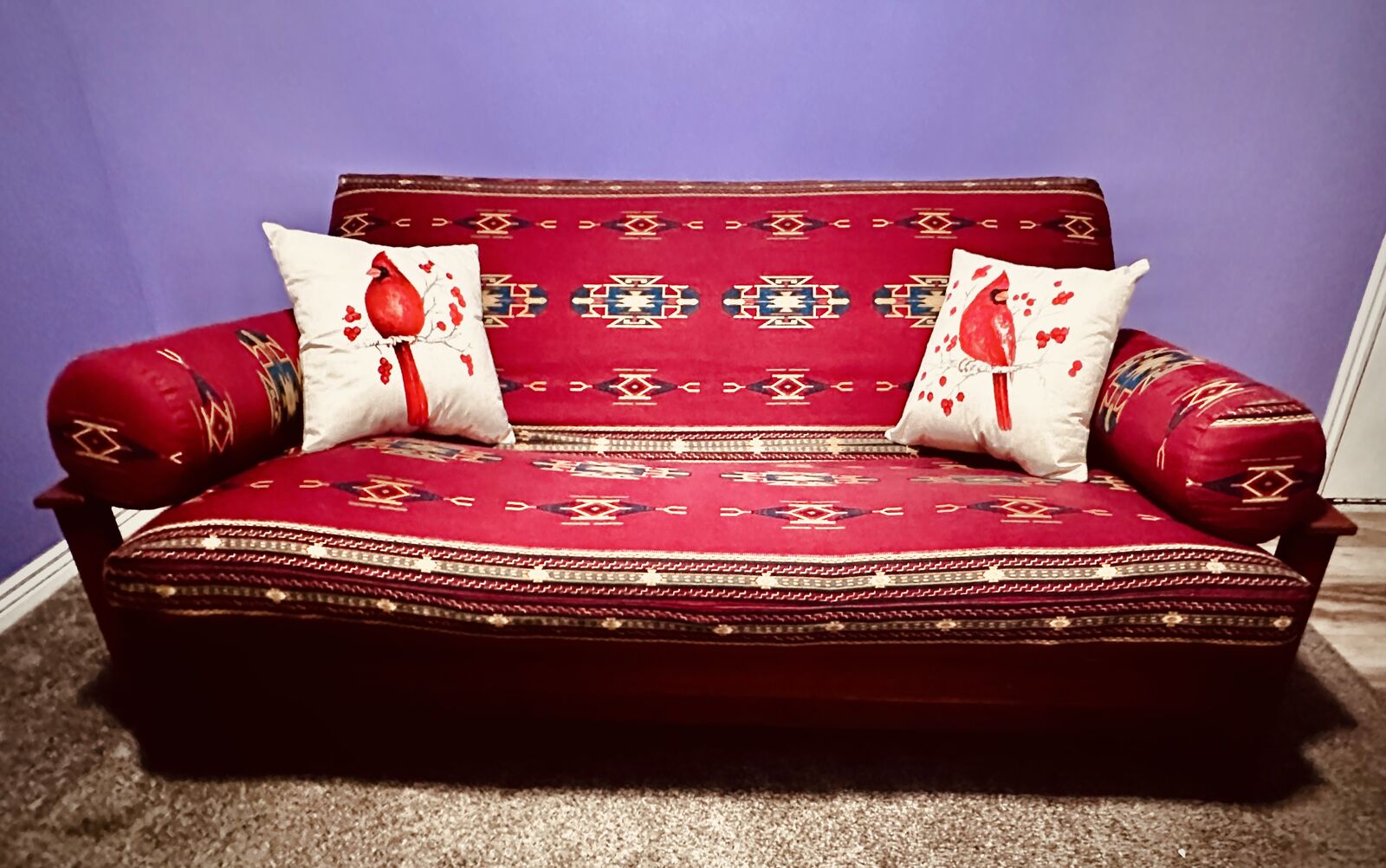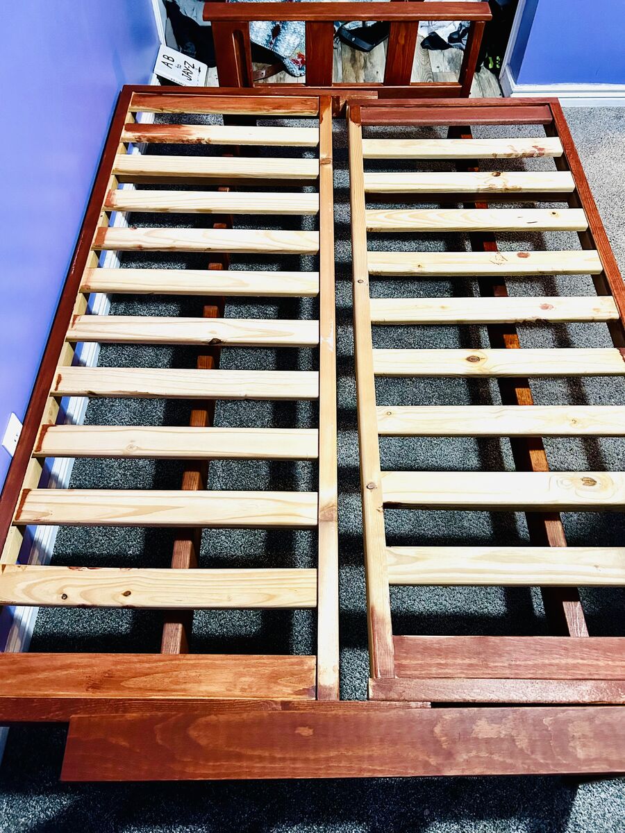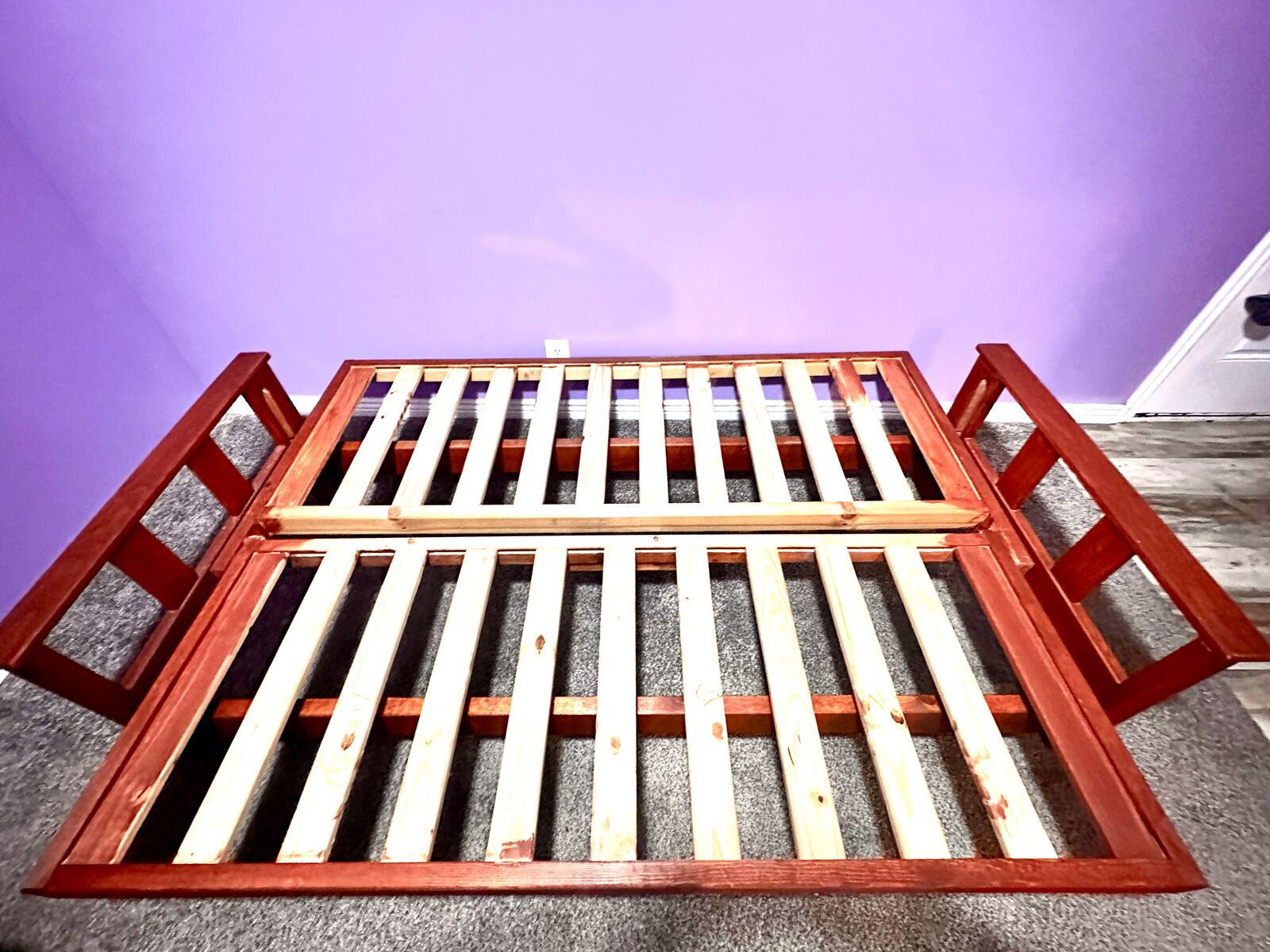 This futon is several years old but was hardly used. There is a toothpaste stain on one side of the cover but it’s in great condition and the wood color is still beautiful.