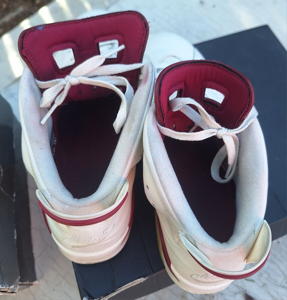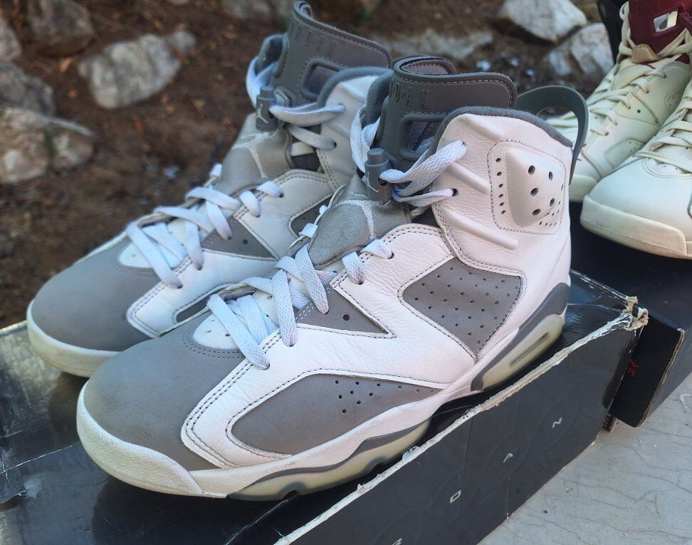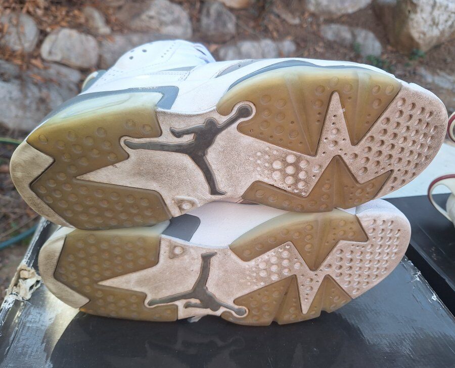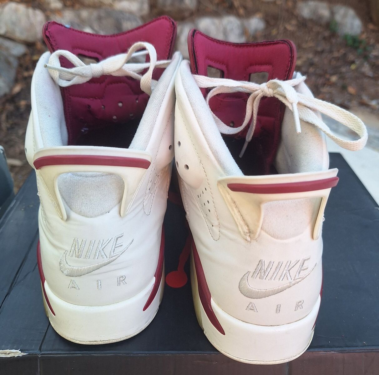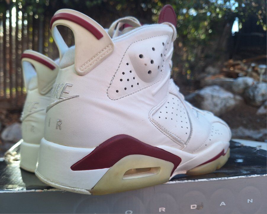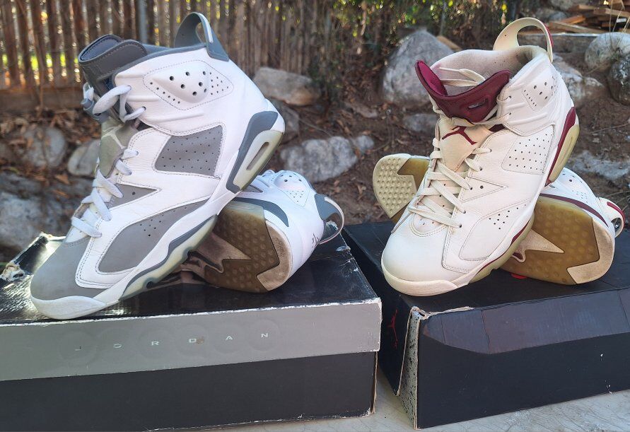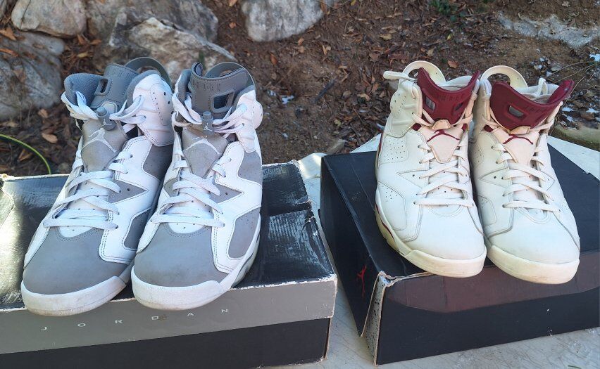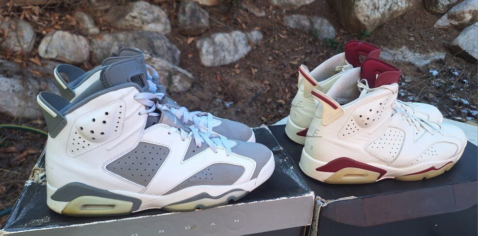 CashAppExperience the nostalgia and comfort of this set of 2 Air Jordan 6 Retros. Size is US Mens 12. Soles on both are still in great condition and they are super comfortable! The only flaw is on the maroon and white pair at the back pull on loop I had to do a repair on, but overall they both still have lots of miles left on them. They have boxes but not the originals and they show wear on the outside. Please see photos for closer details, and thanks for looking!